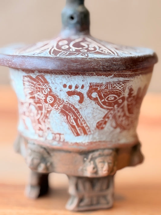 Vasija grabada trípode con tapa y mascara teotihuacana