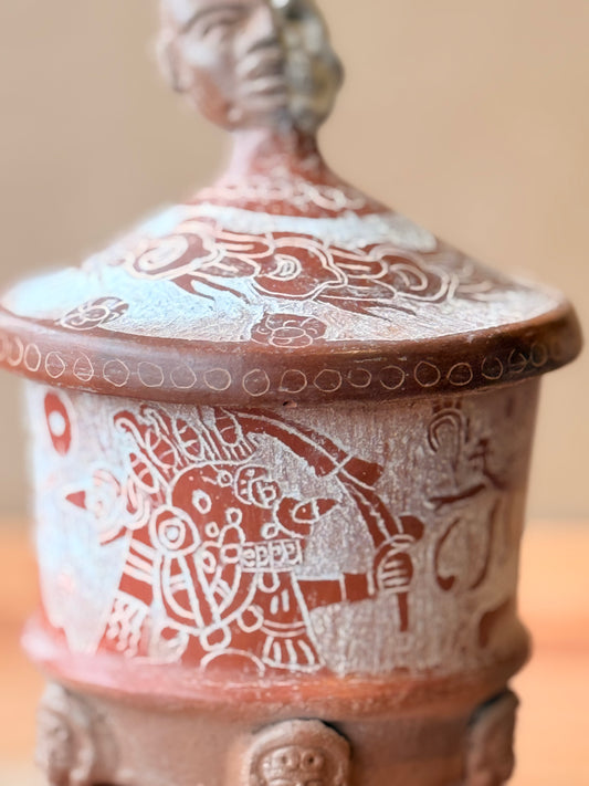 Vasija grande grabada trípode con tapa quetzalcoatl