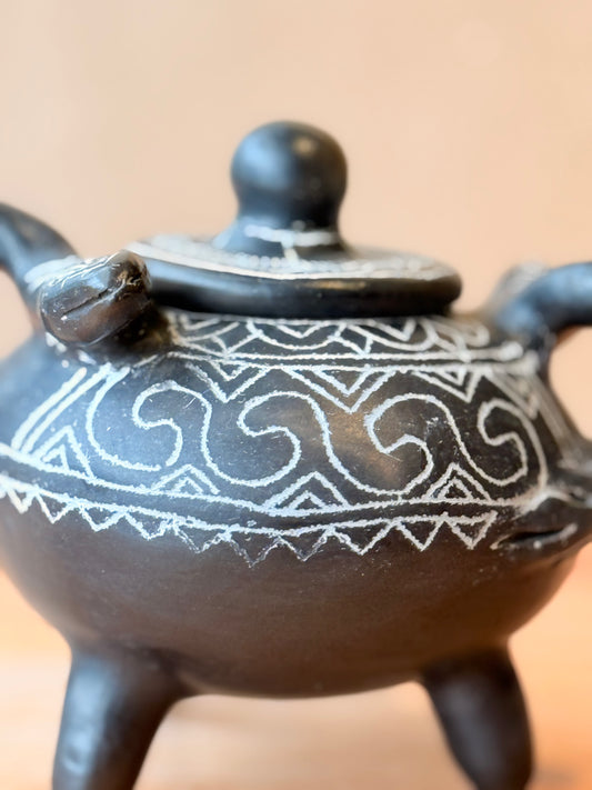Vasija chica grabada trípode con tapa quetzalcoatl