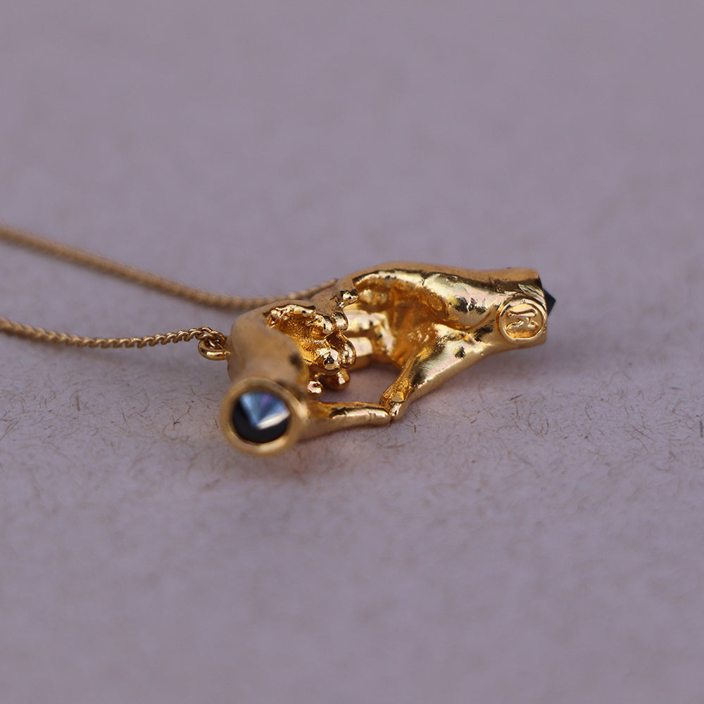 Dije de chapa de oro con escultura 3D de dos manos formando un corazon con incrustaciones de zirconia y cadena.