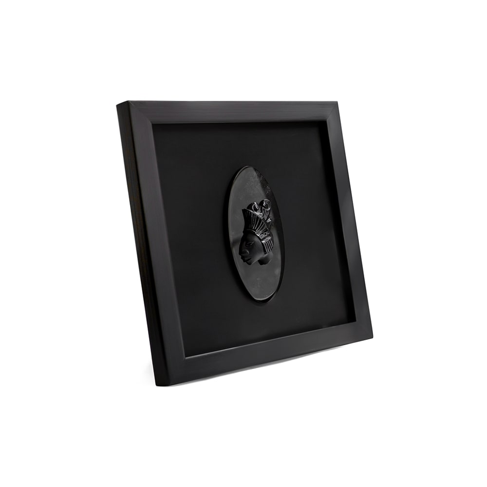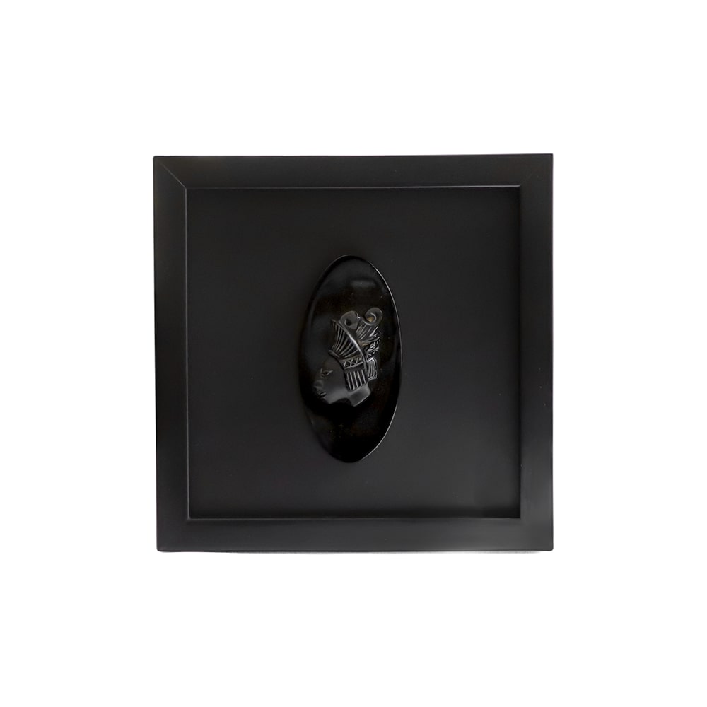 Cuadro de madera con cabeza maya tallada a mano de obsidiana negra acabado mate.