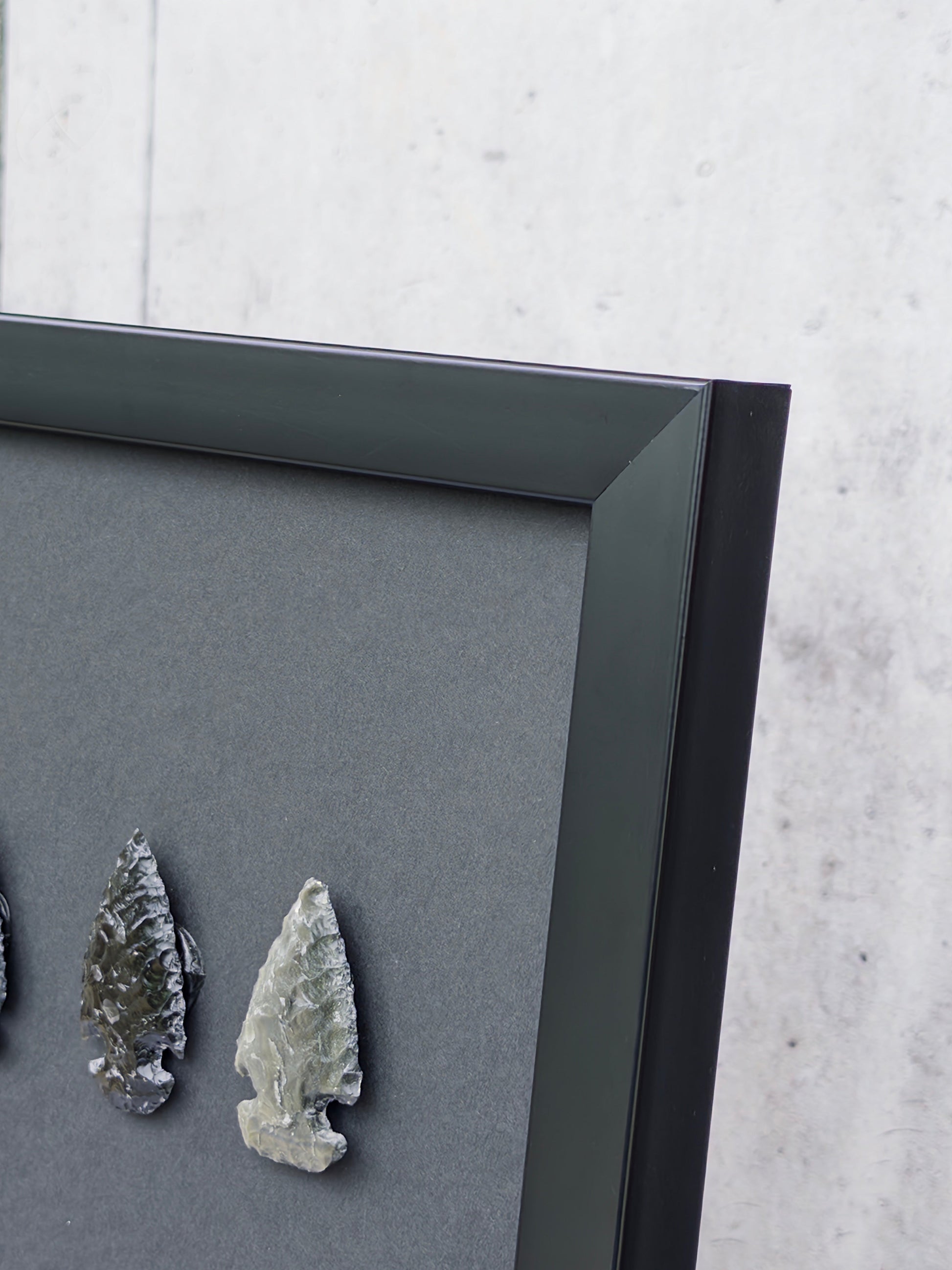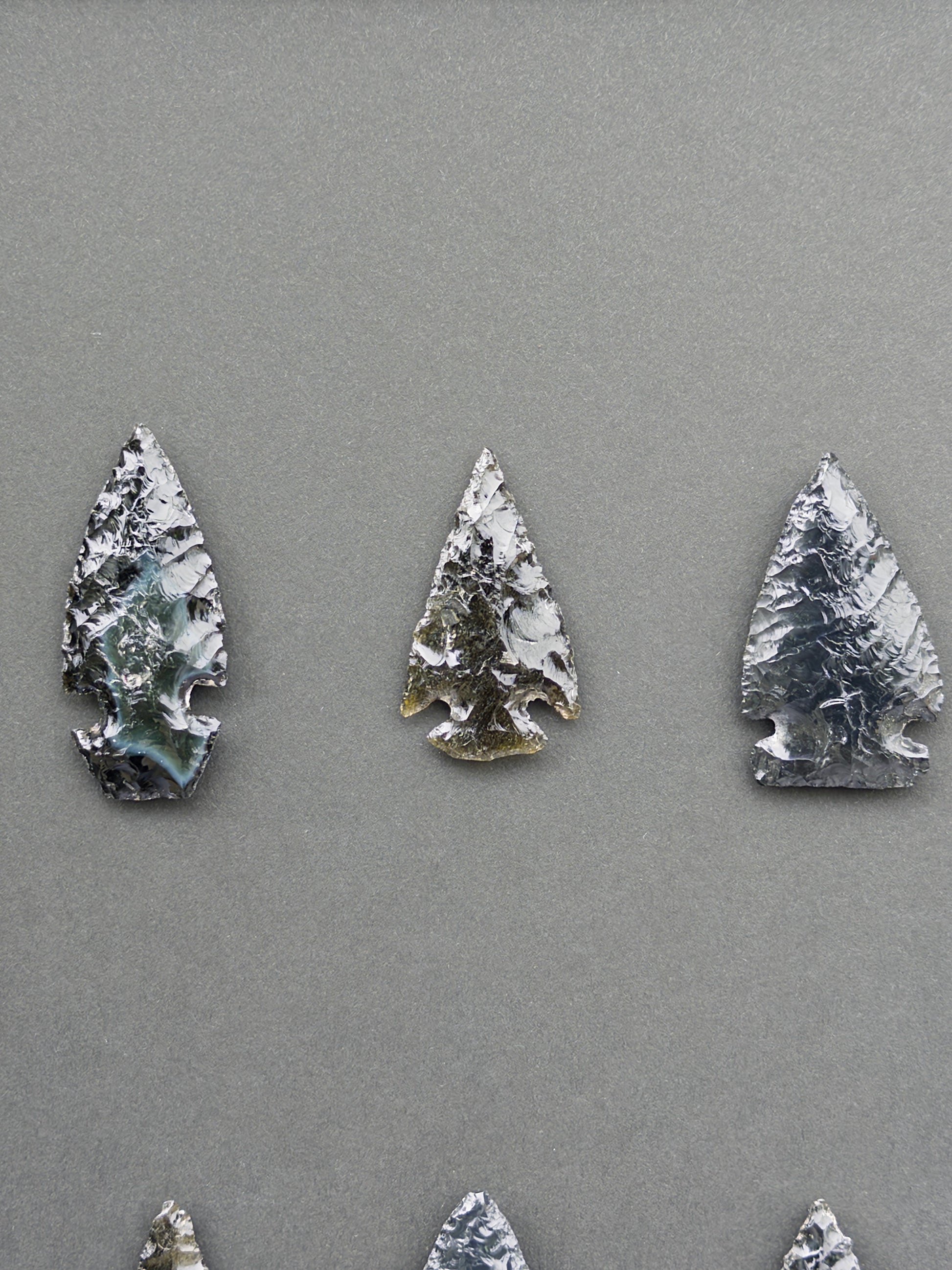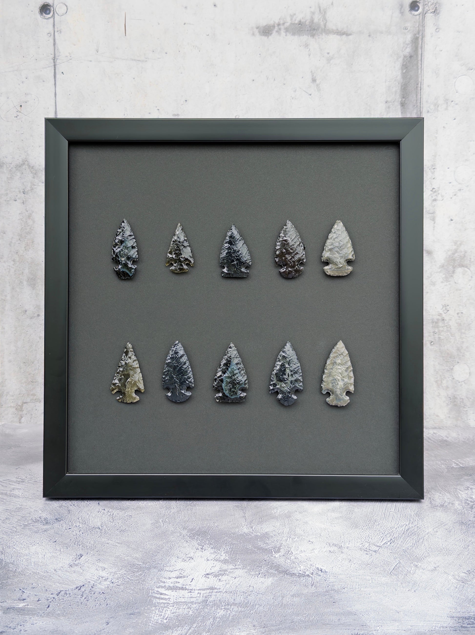 Cuadro con 10 puntas de flechas de obsidiana con distintos tamaños y formas