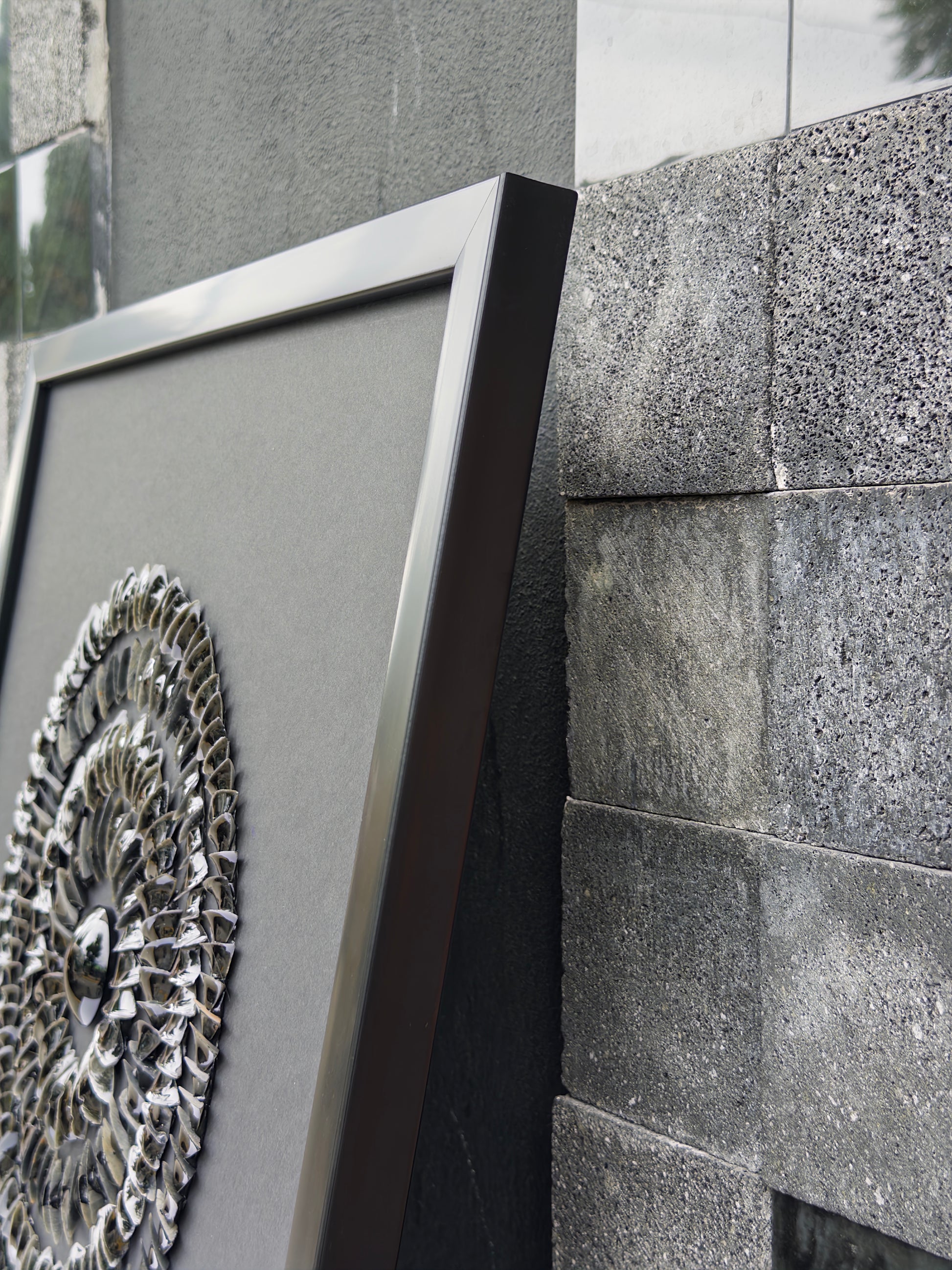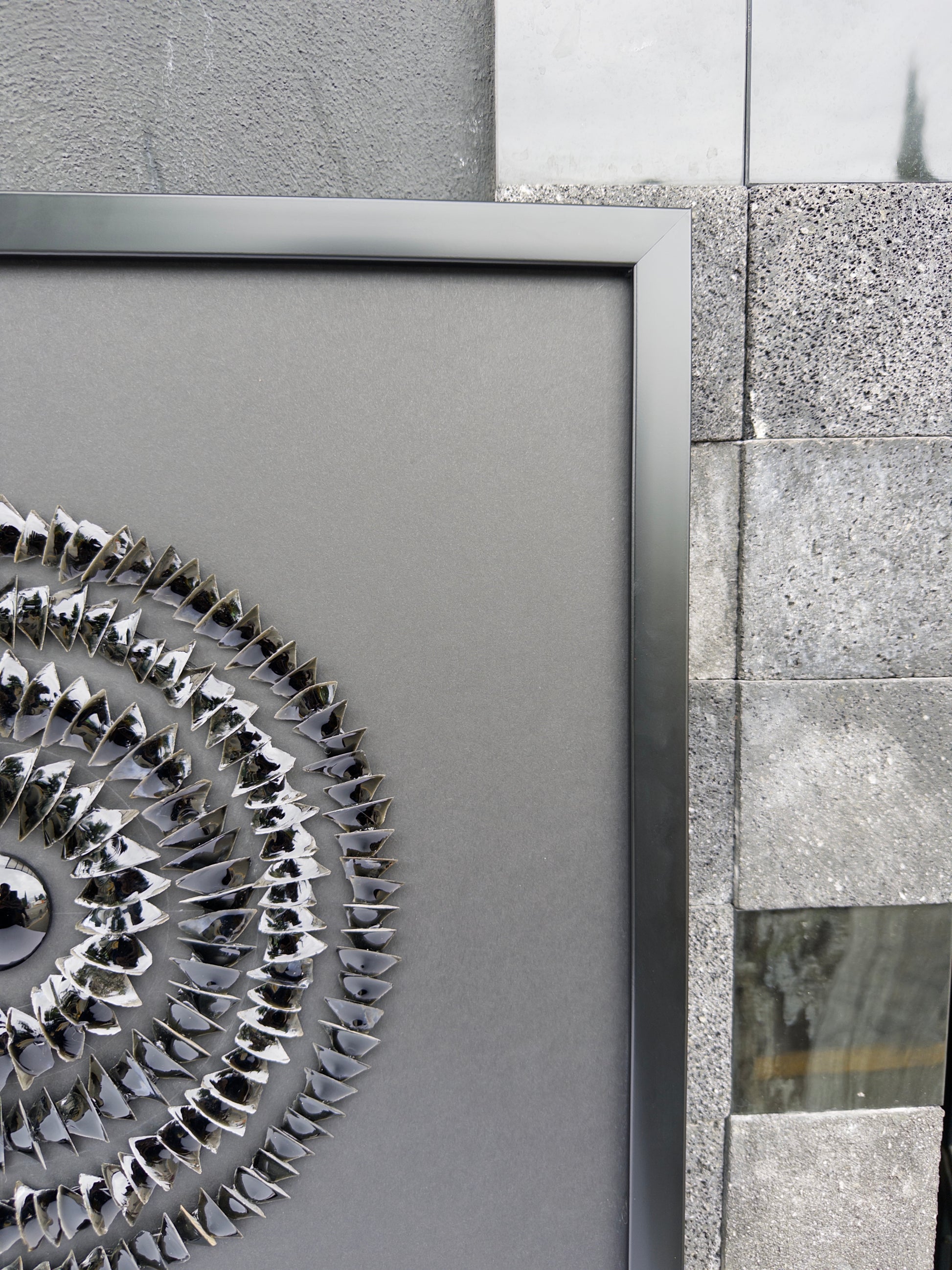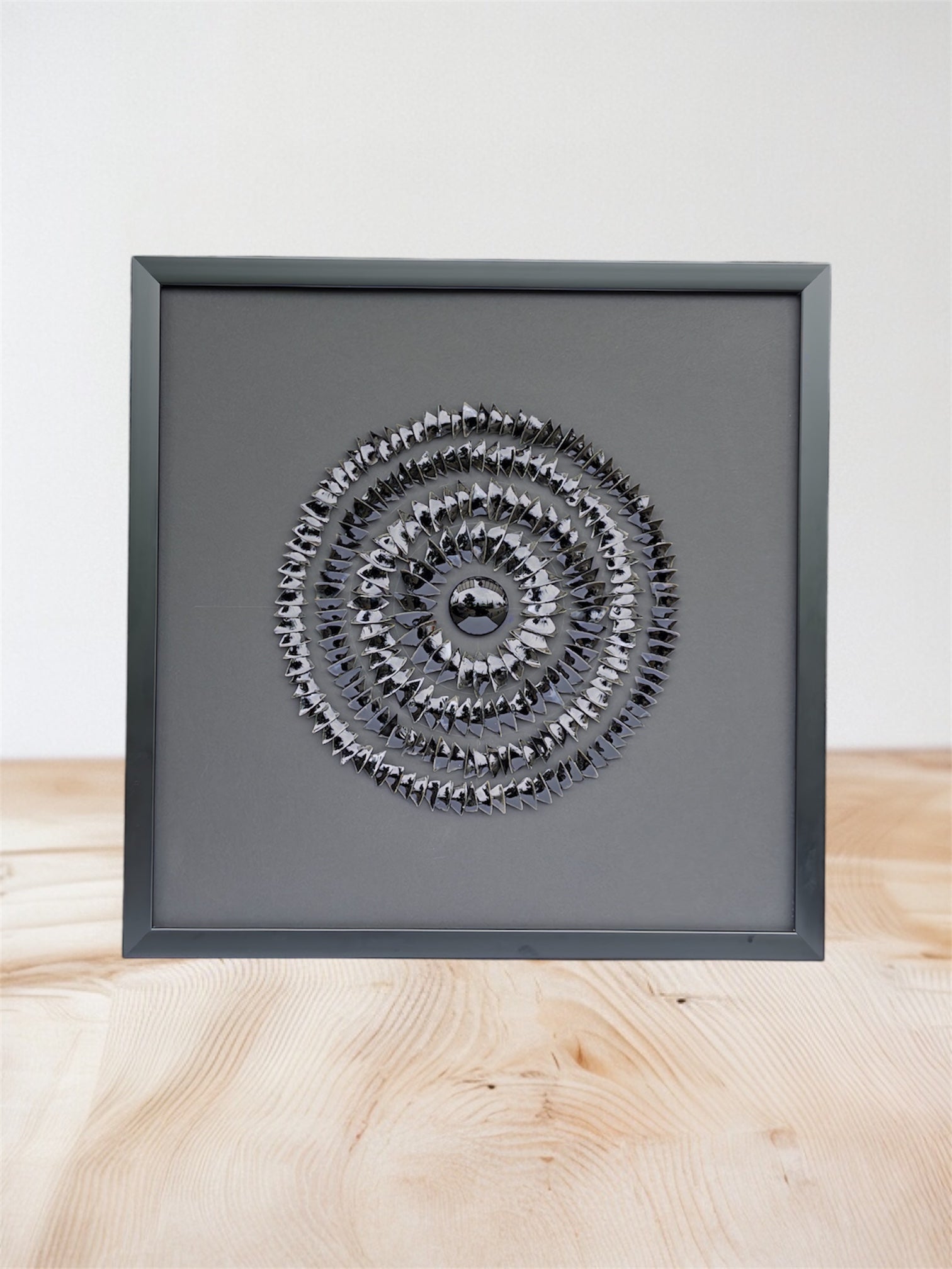 Cuadro negro compuesto de diminutas flechas de obsidiana negra y dorada acomodados de manera circular.. con un cabujón central de obsidiana negra
