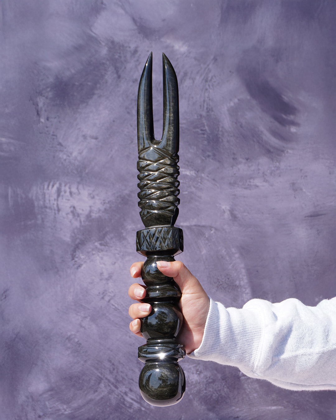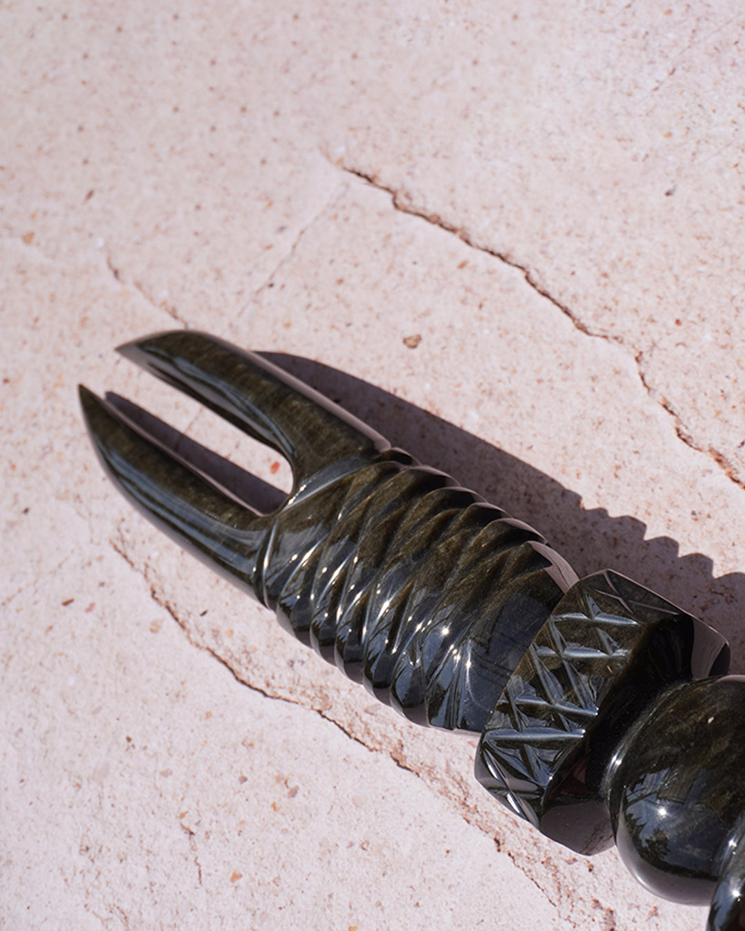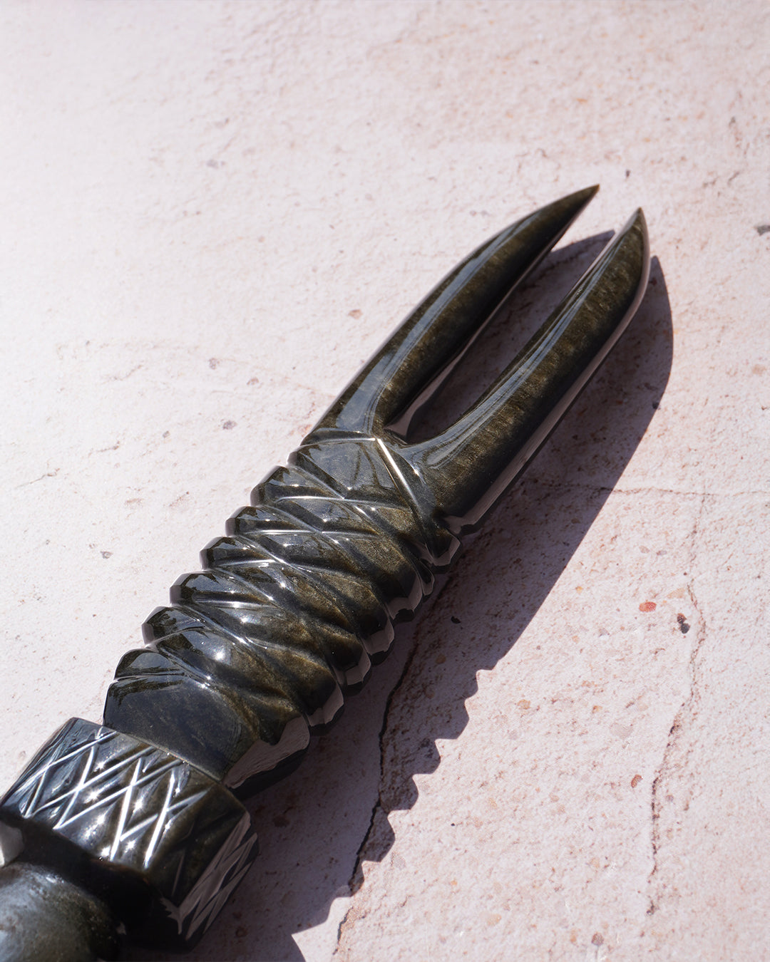 Daga de obsidiana dorada con punta doble que asemeja las pinzas de un escarabajo hercules