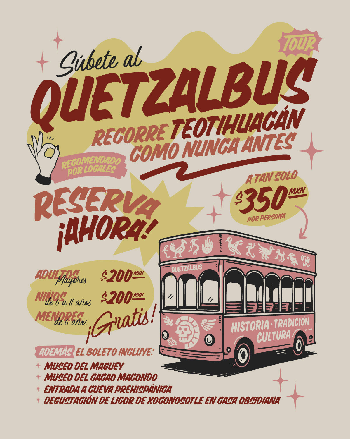 Durante dos horas, el Quetzalbus te guía por cuevas prehispánicas, pueblos mágicos, museos y el circuito arqueológico, ofreciéndote las mejores vistas de la Calzada de los Muertos, la Pirámide del Sol y la Luna. Además, incluye degustaciones y experiencias únicas que conectan tradición, cultura y sabor.