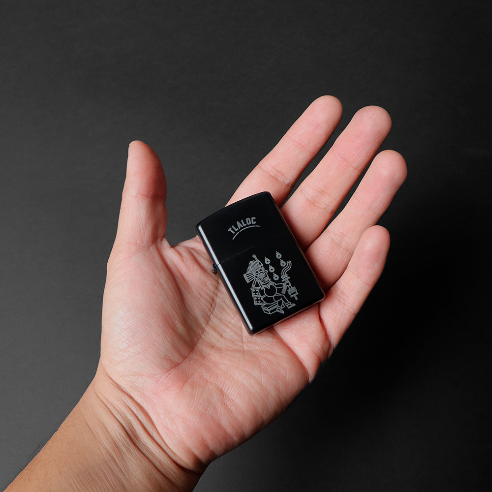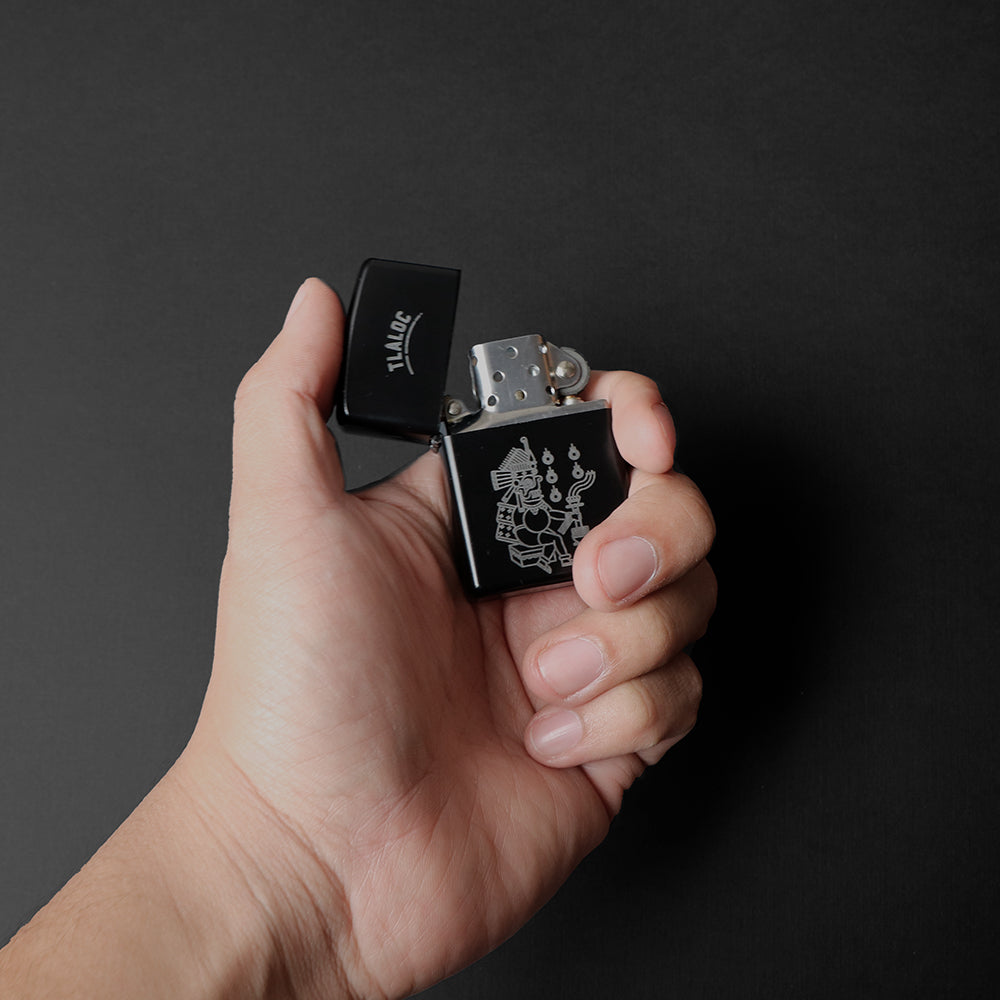 Encendedor liso acabado en mate, grabado Tláloc, deidad de los cerros, del agua y de la fertilidad. Según la cultura náhuatl, regía fenómenos meteorológicos como los relámpagos, los truenos, el granizo o las tormentas.