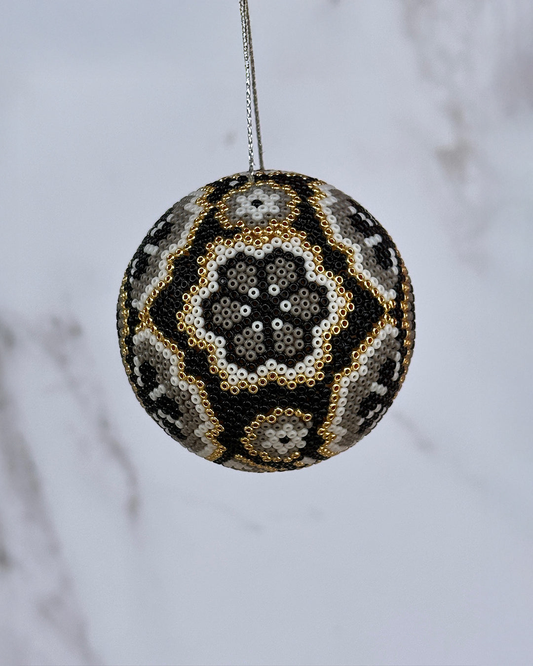 ·Esfera de unicel con chaquiras de cristal con diseños alusivos a la cosmovisión wixarika.