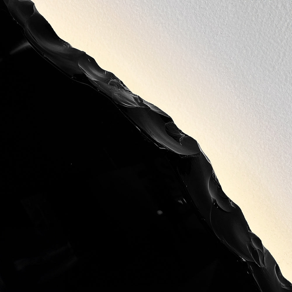 Espejo circular de obsidiana negra con perímetro lascado de 44cm de diámetro, incluye luz led en luz cálida y estructura metálica con la que se fijará a muro.