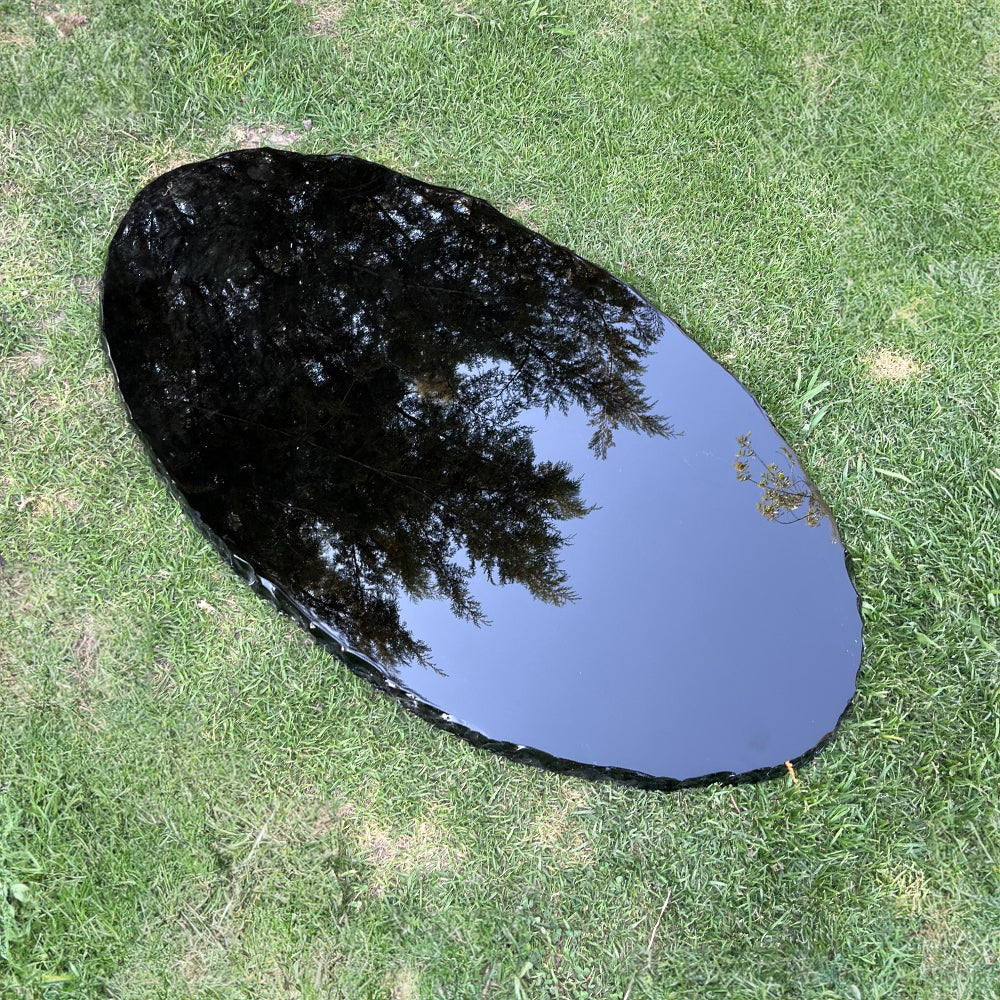 Espejo elíptico de obsidiana negra con perímetro lascado de 113cm de alto x 63cm de ancho x 3cm de espesor, incluye luz led en luz cálida y estructura metálica con la que se fijará a muro.