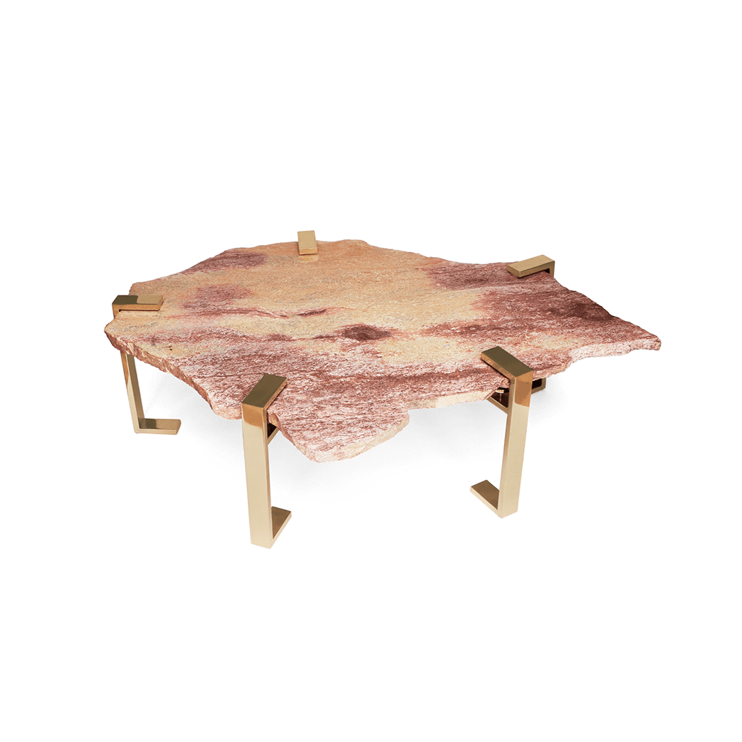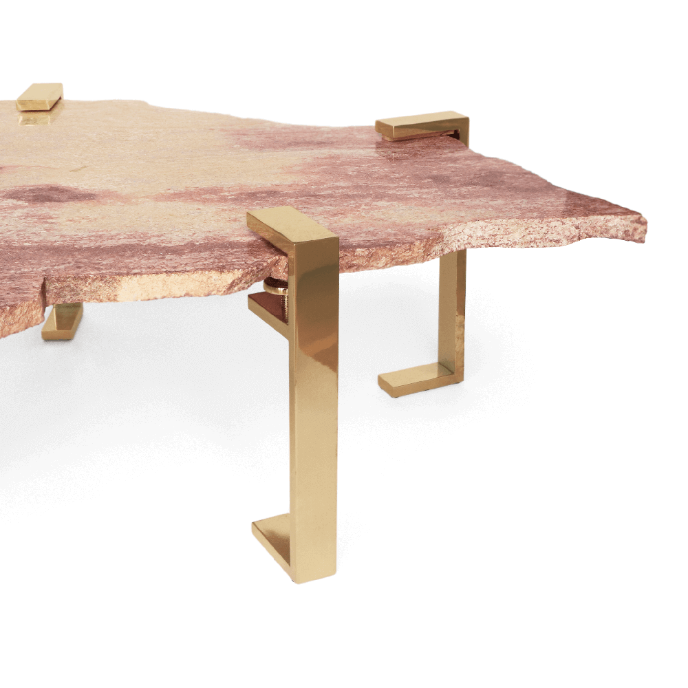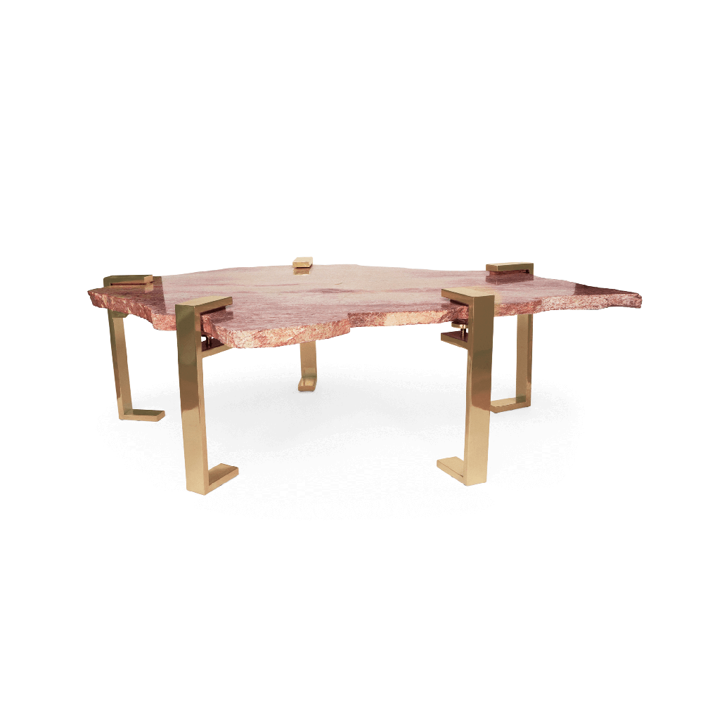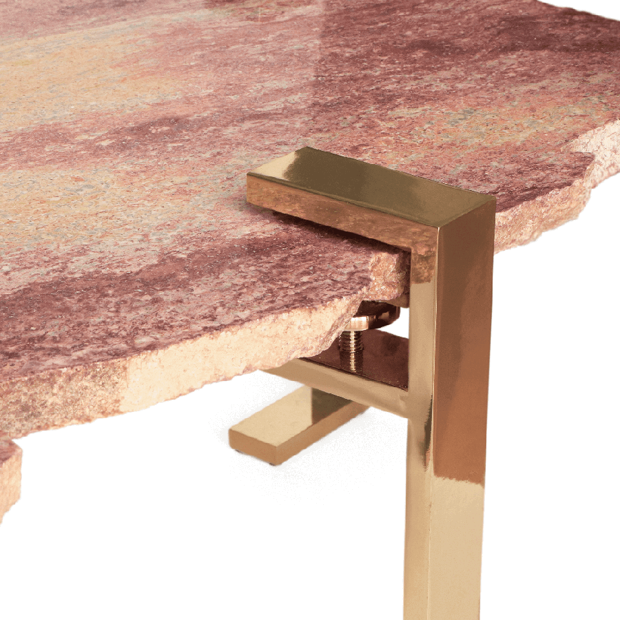Mesa de calcedonia rosa, con 5 patas de acero con baño de latón.