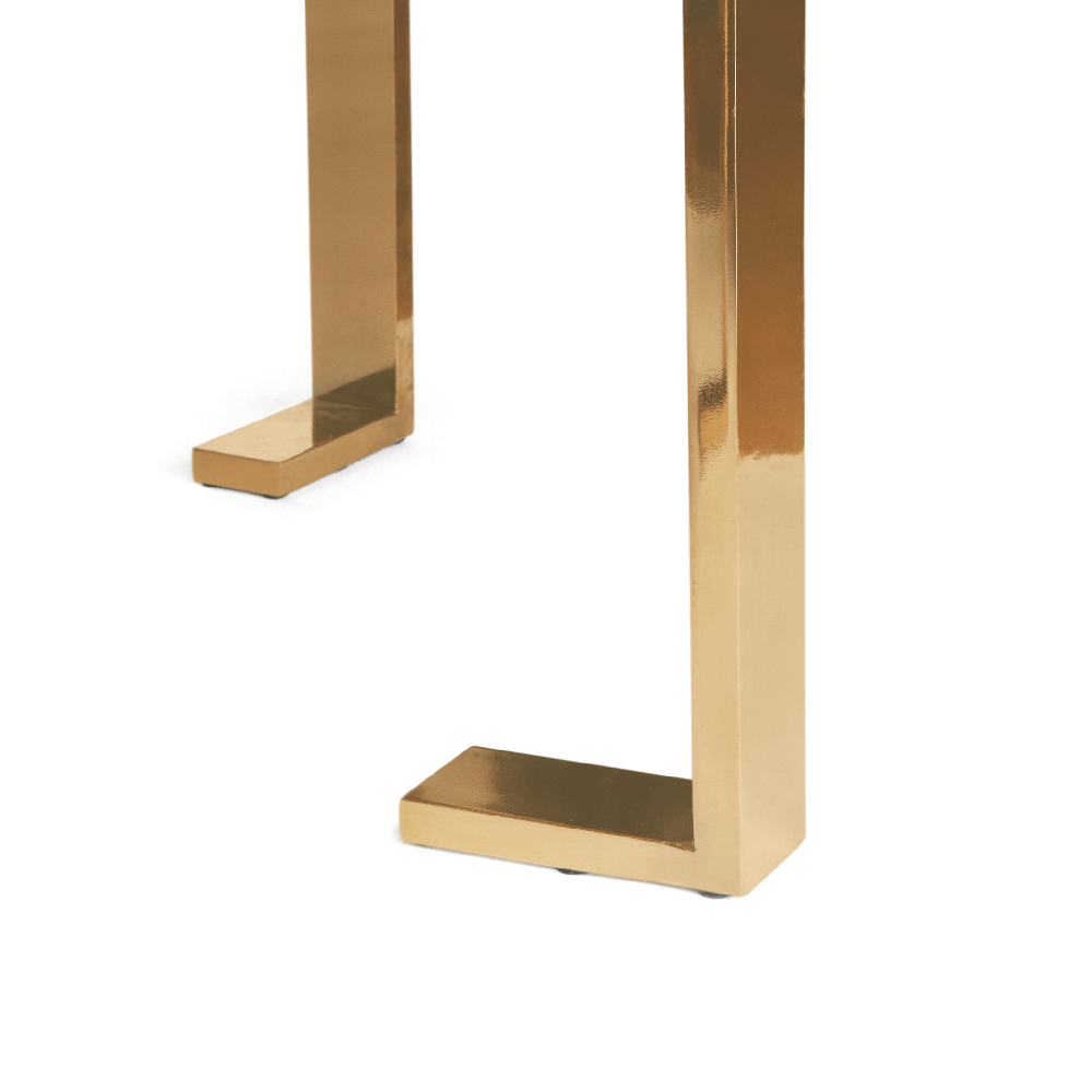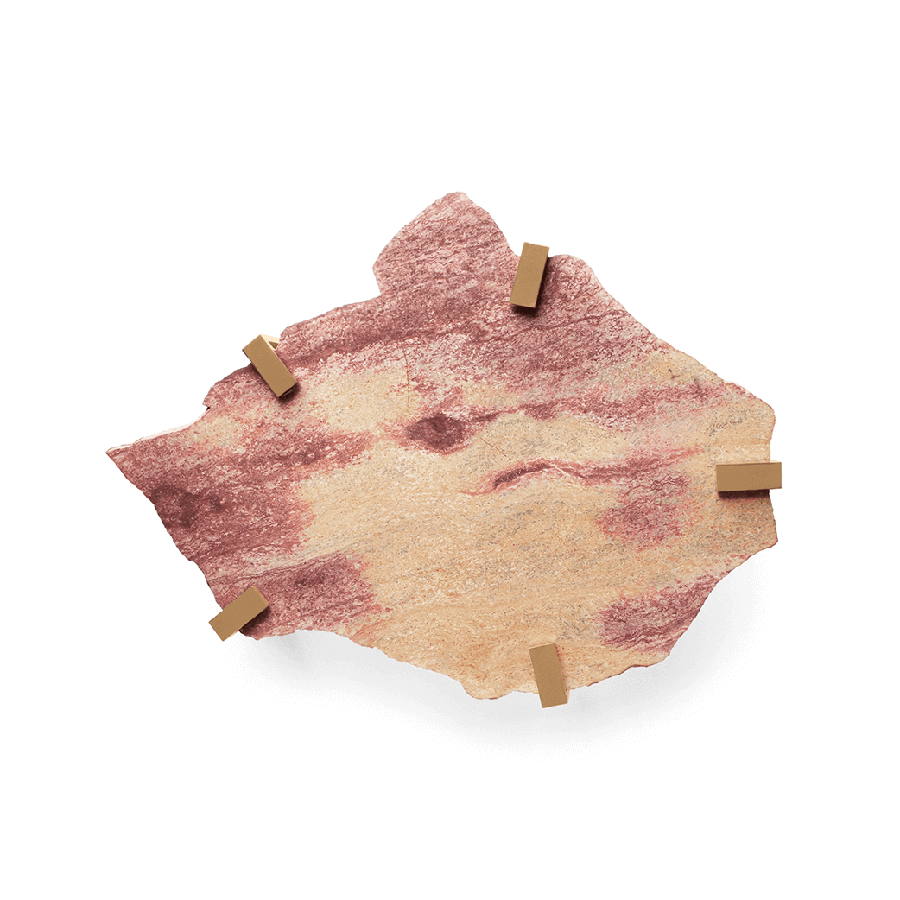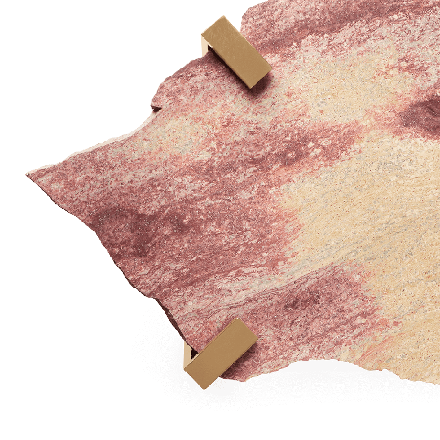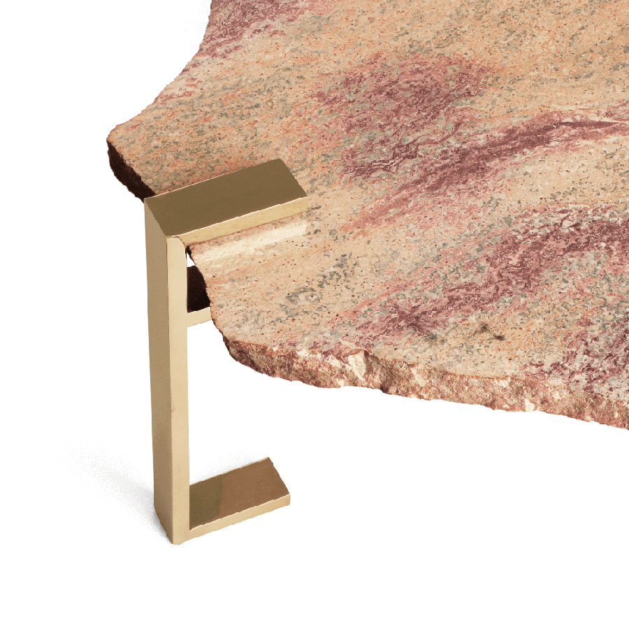 Mesa de calcedonia rosa, con 5 patas de acero con baño de latón.