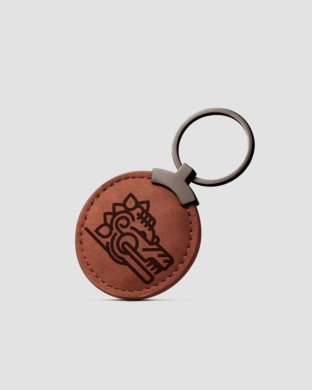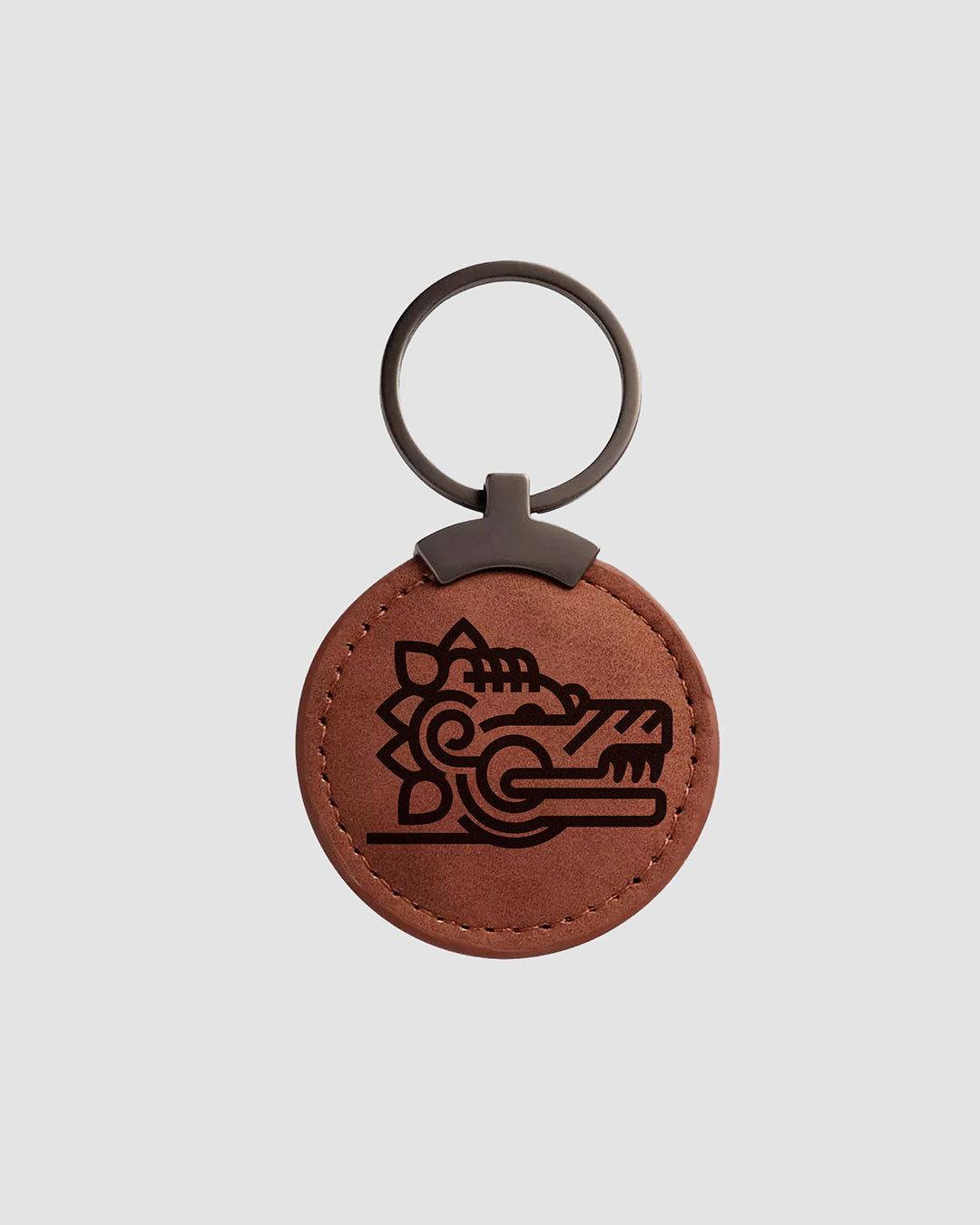 Llavero circular de curpiel café con relleno y herraje metálico, grabado Quetzalcóatl, deidad de la vida, la luz, la fertilidad, la civilización y el conocimiento.