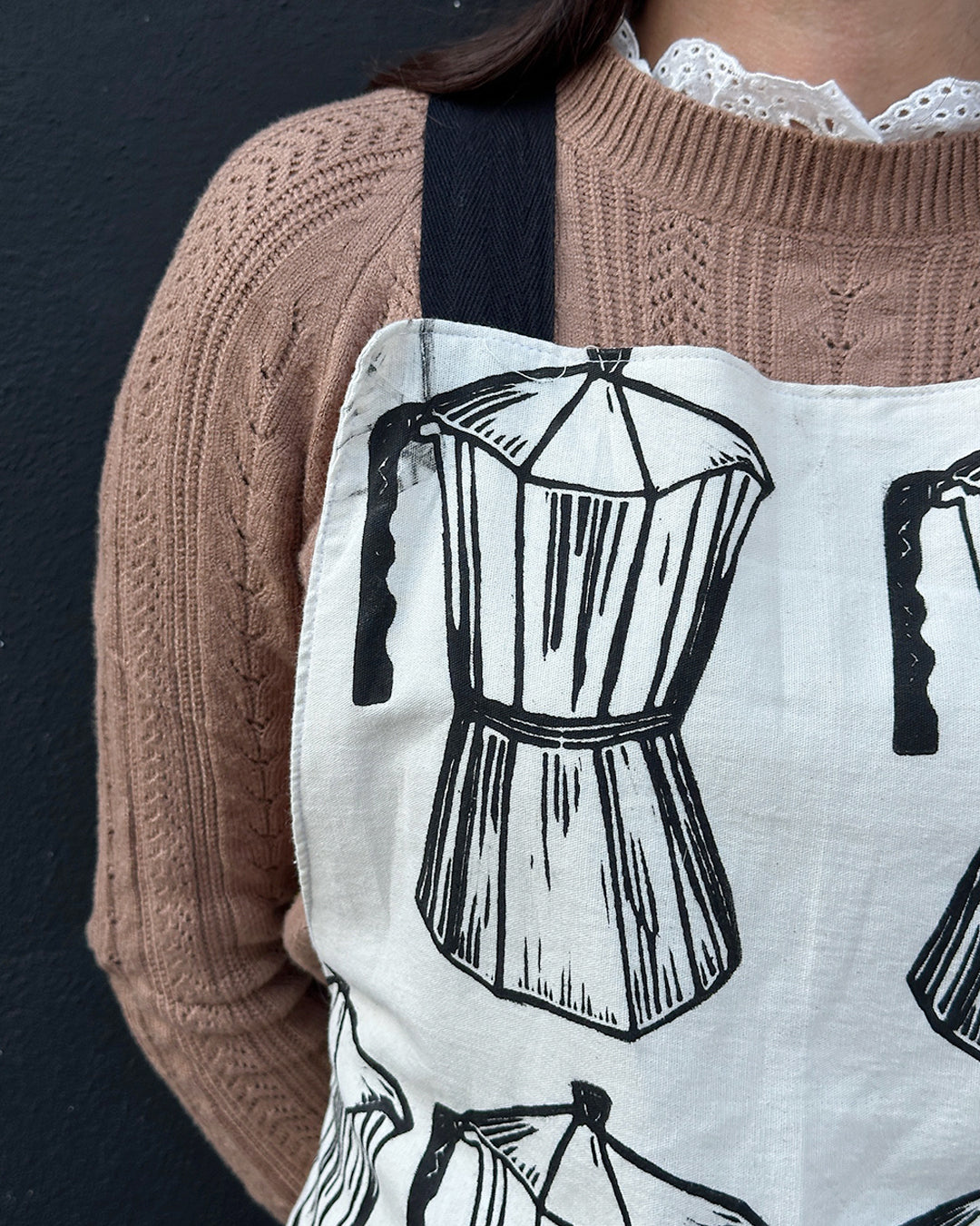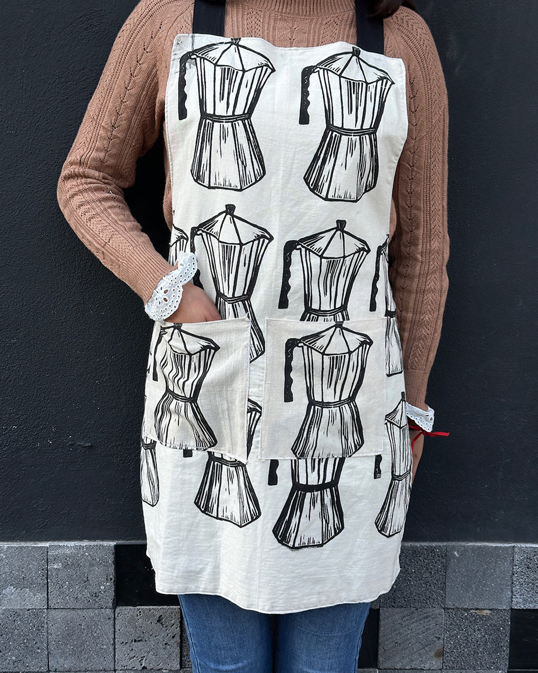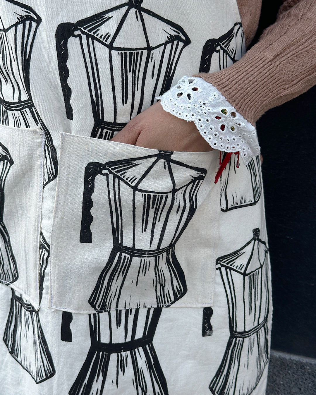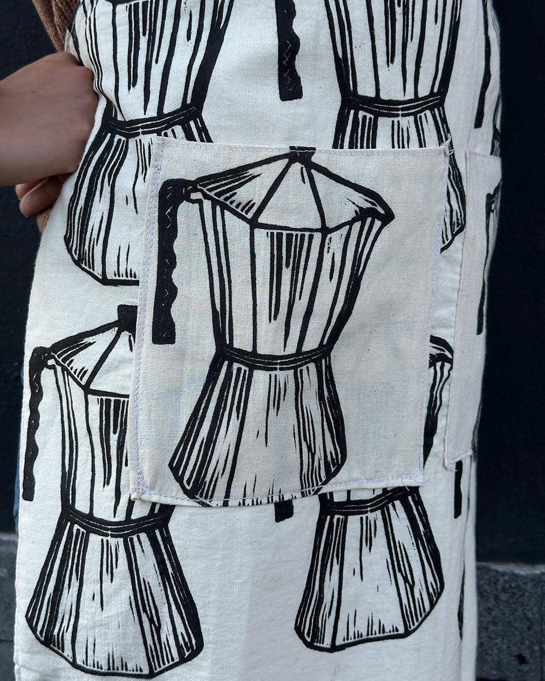 ·mandil de manta prelavada con impresión de linografia con figuras de cafetera