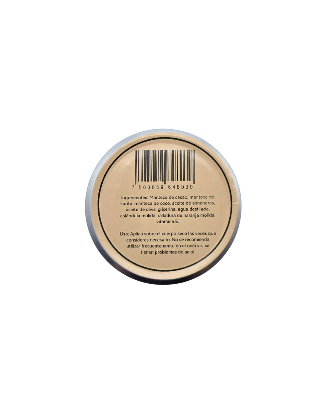 Ingredientes: Manteca de cacao, manteca de karité, manteca de coco, aceite de almendras, aceite de oliva, aceite de caléndula, cera de abeja, glicerina, agua destilada, sorbato de potasio, benzoato de sodio, caléndula molida, ralladura de naranja, vitamina E, aceite esencial de naranja..