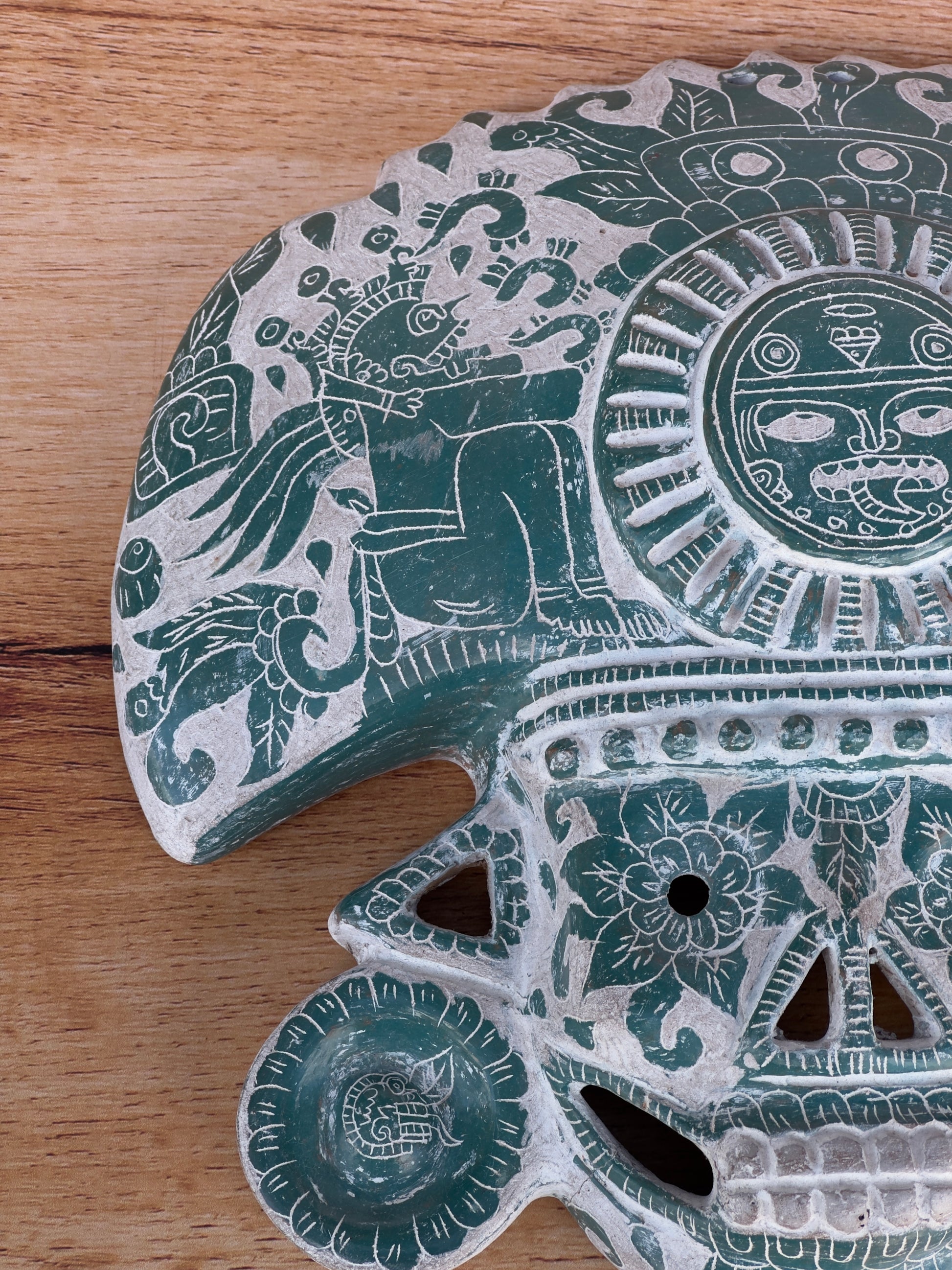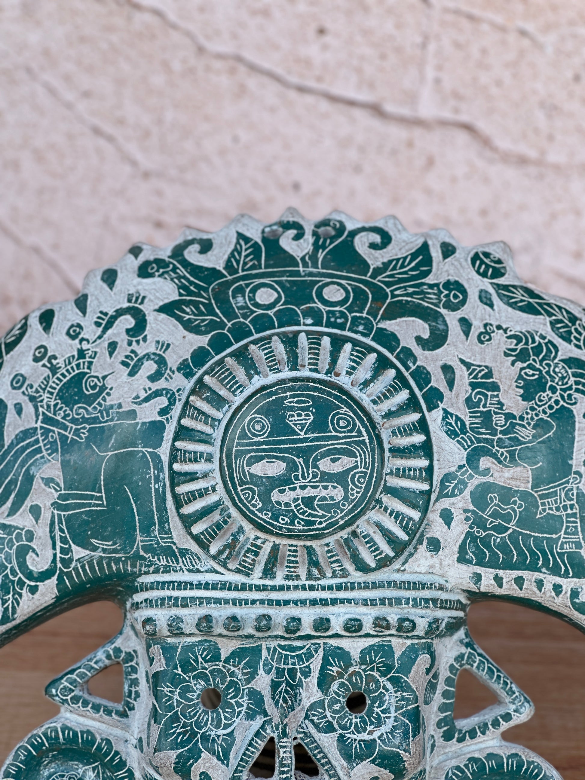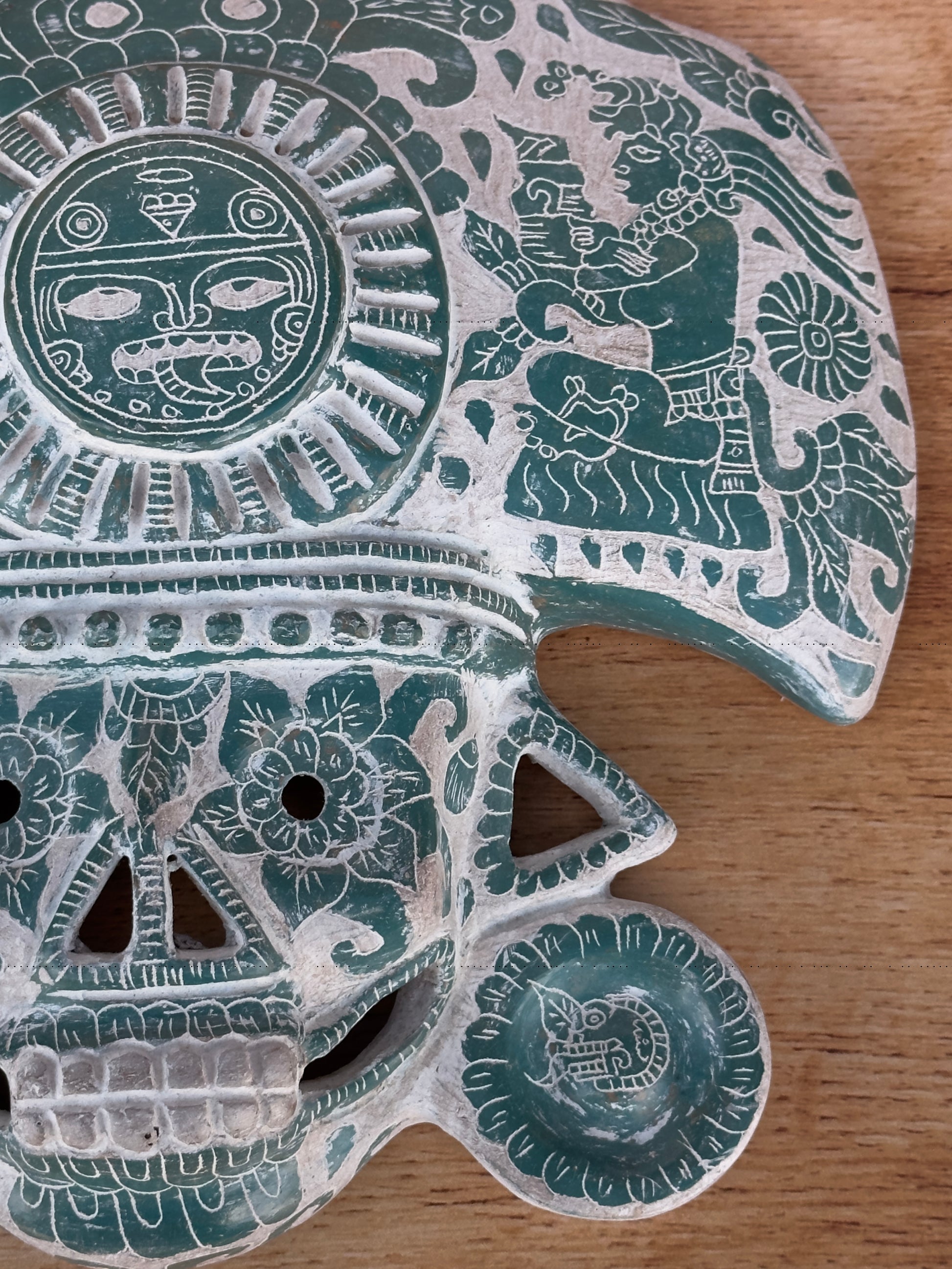 mascara mictlantecuhtli de barro hecha a mano con grabados color verde