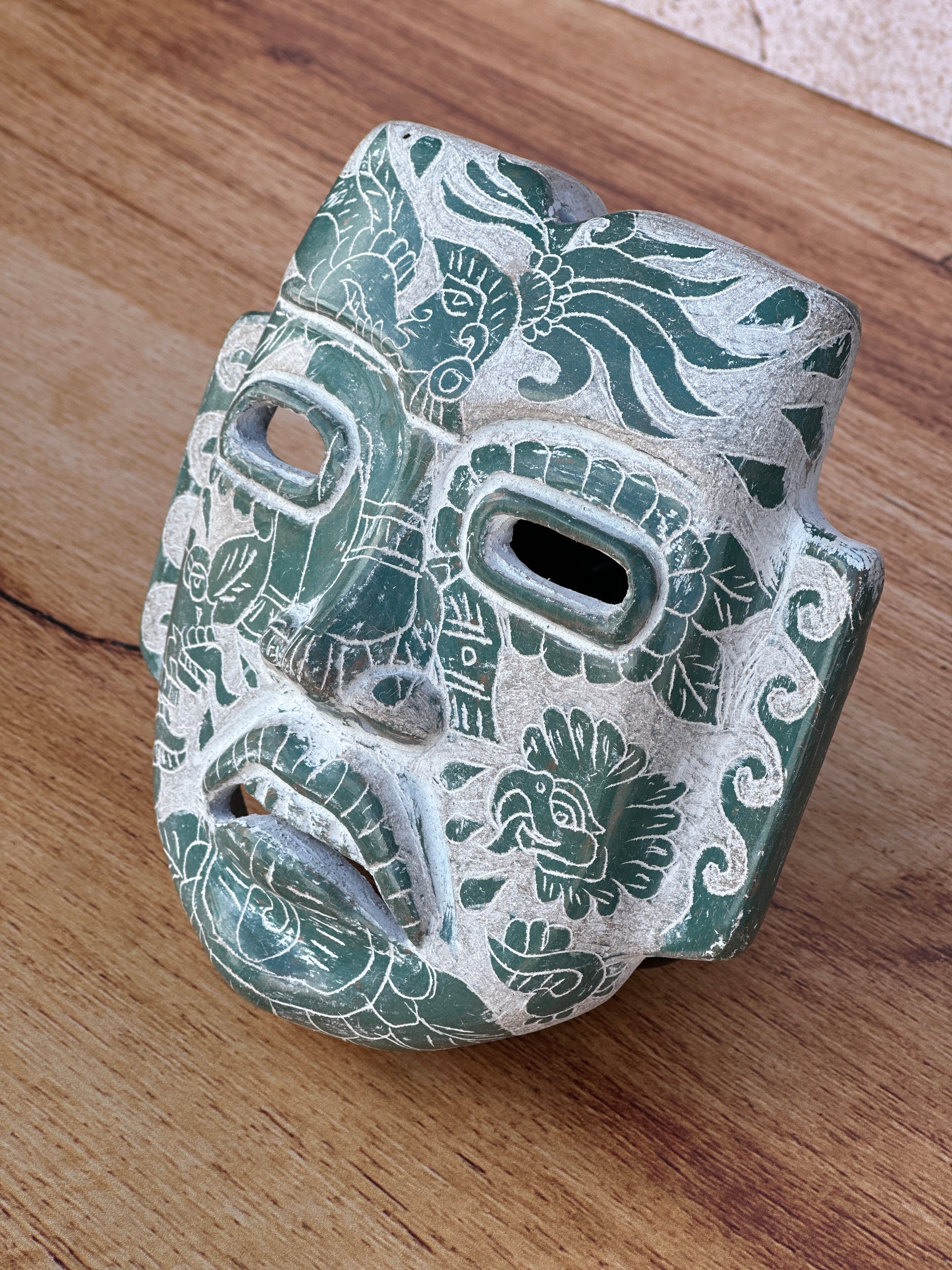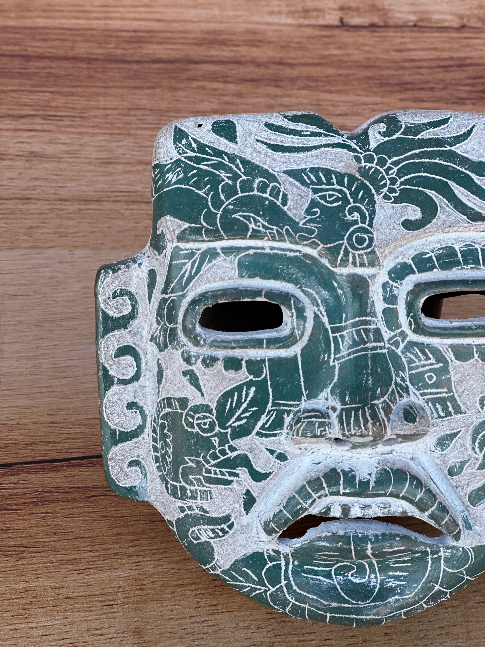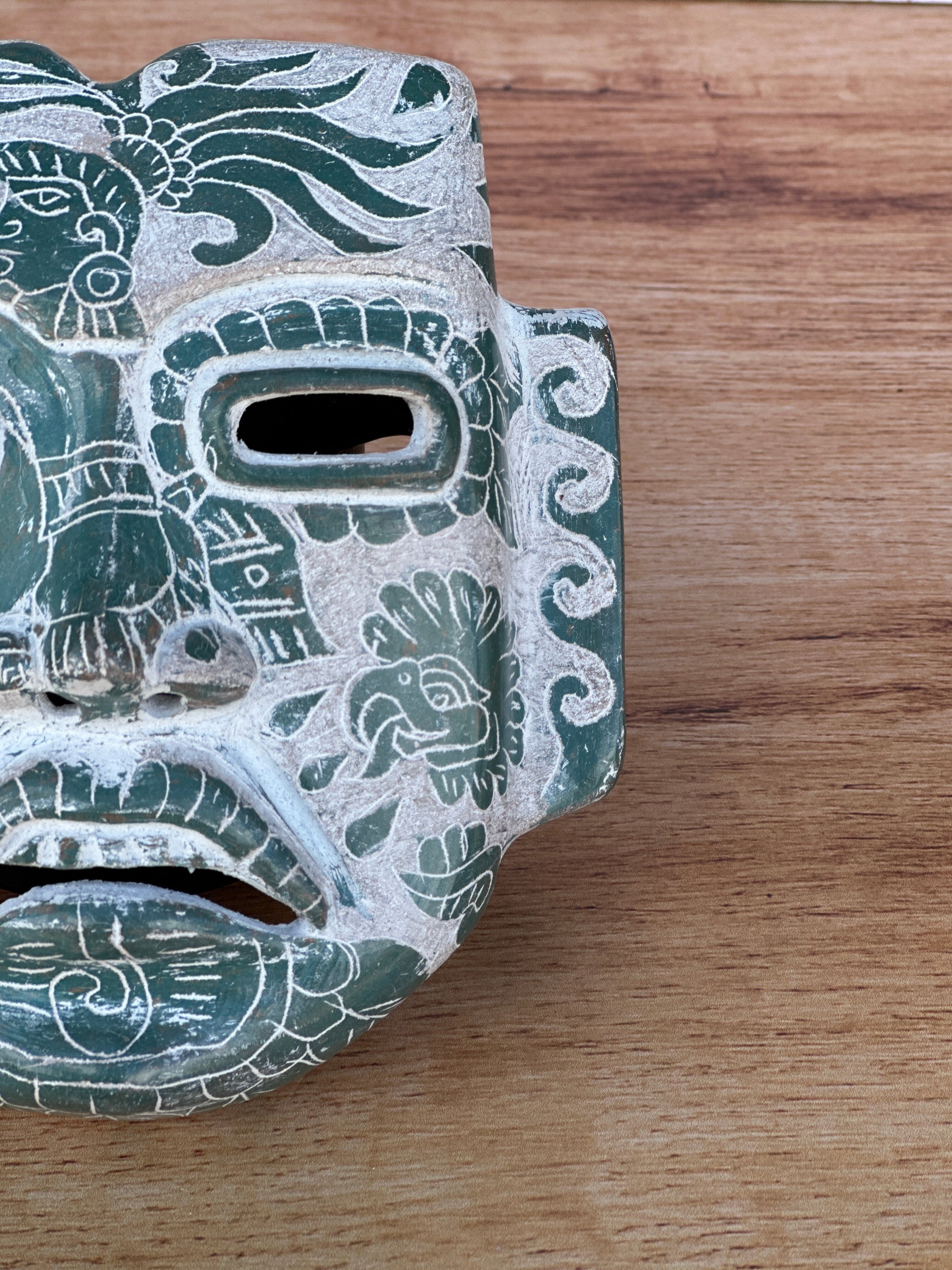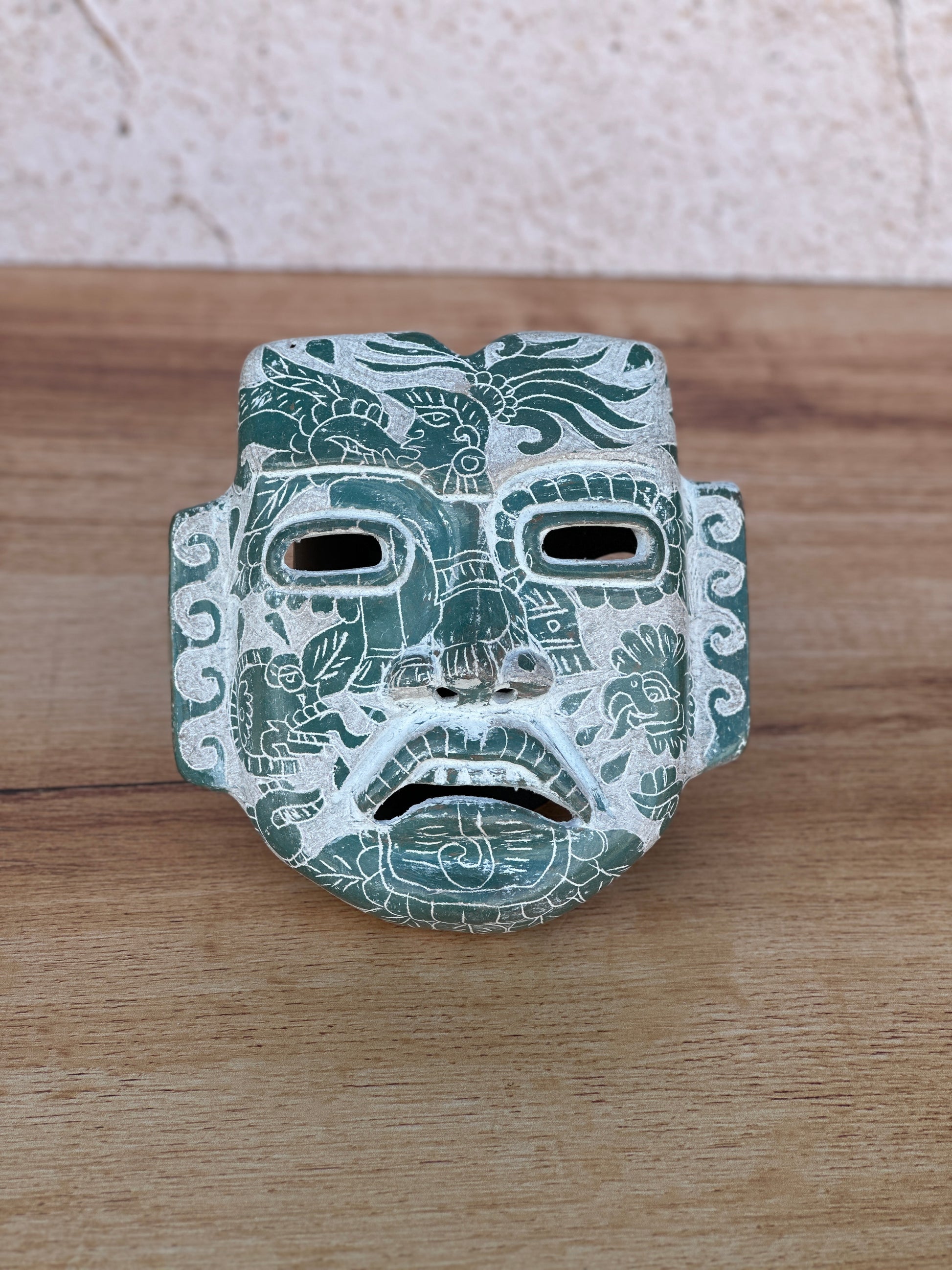 mascara de imagen olmeca de barro con grabados hechos a mano
