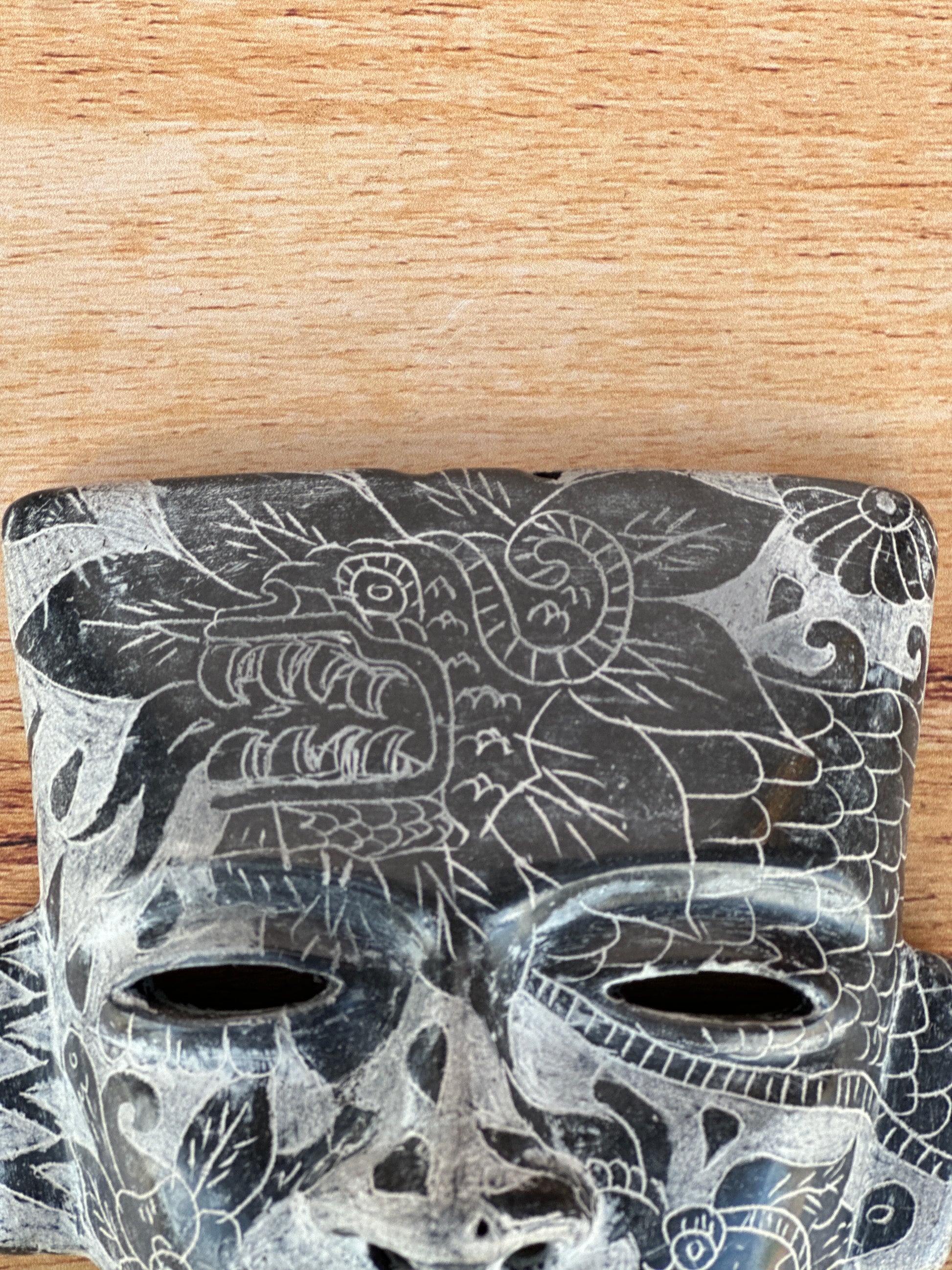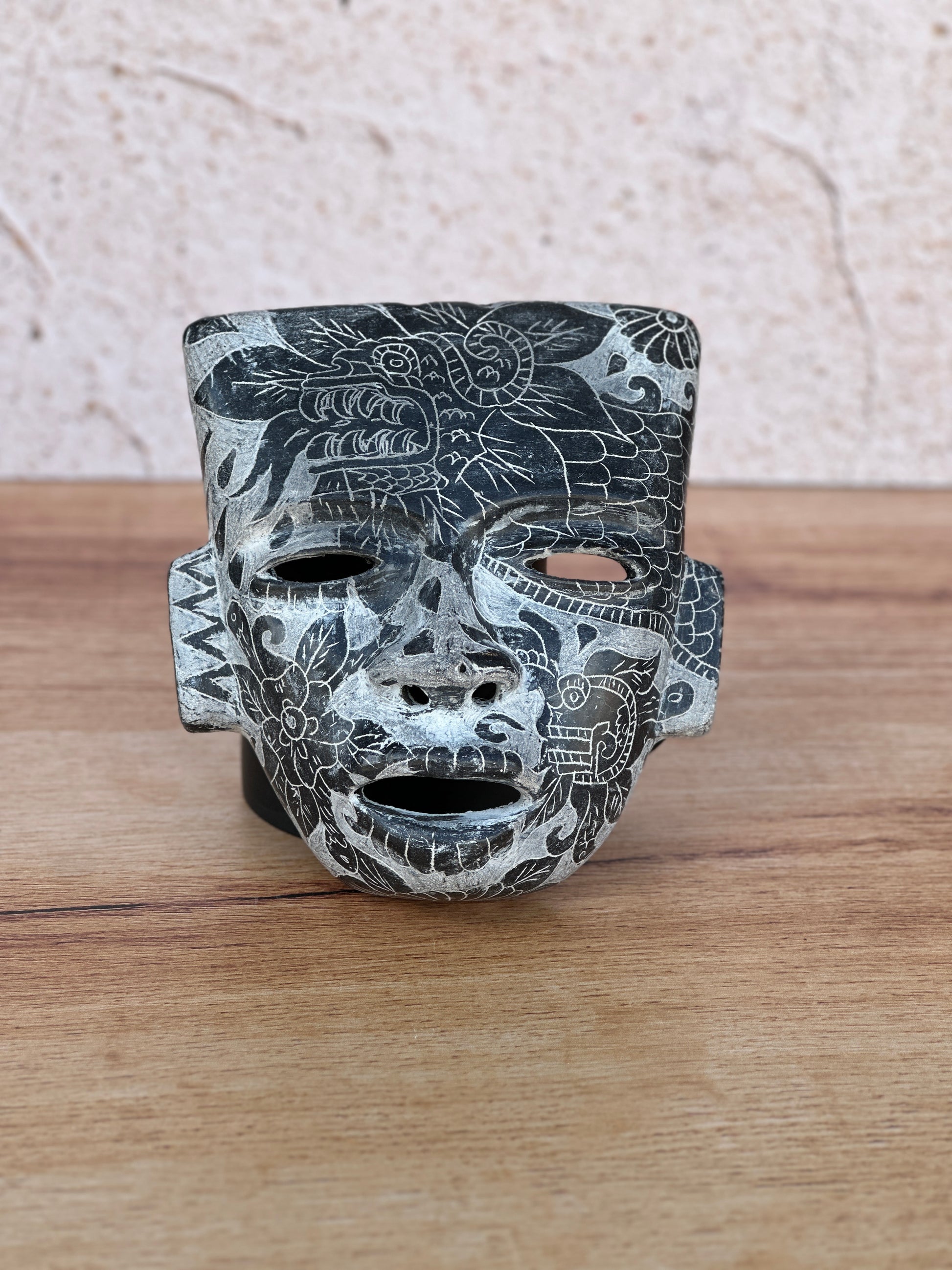 mascara teotihuacana de barro hecha a mano con grabados de quetzalcoatl