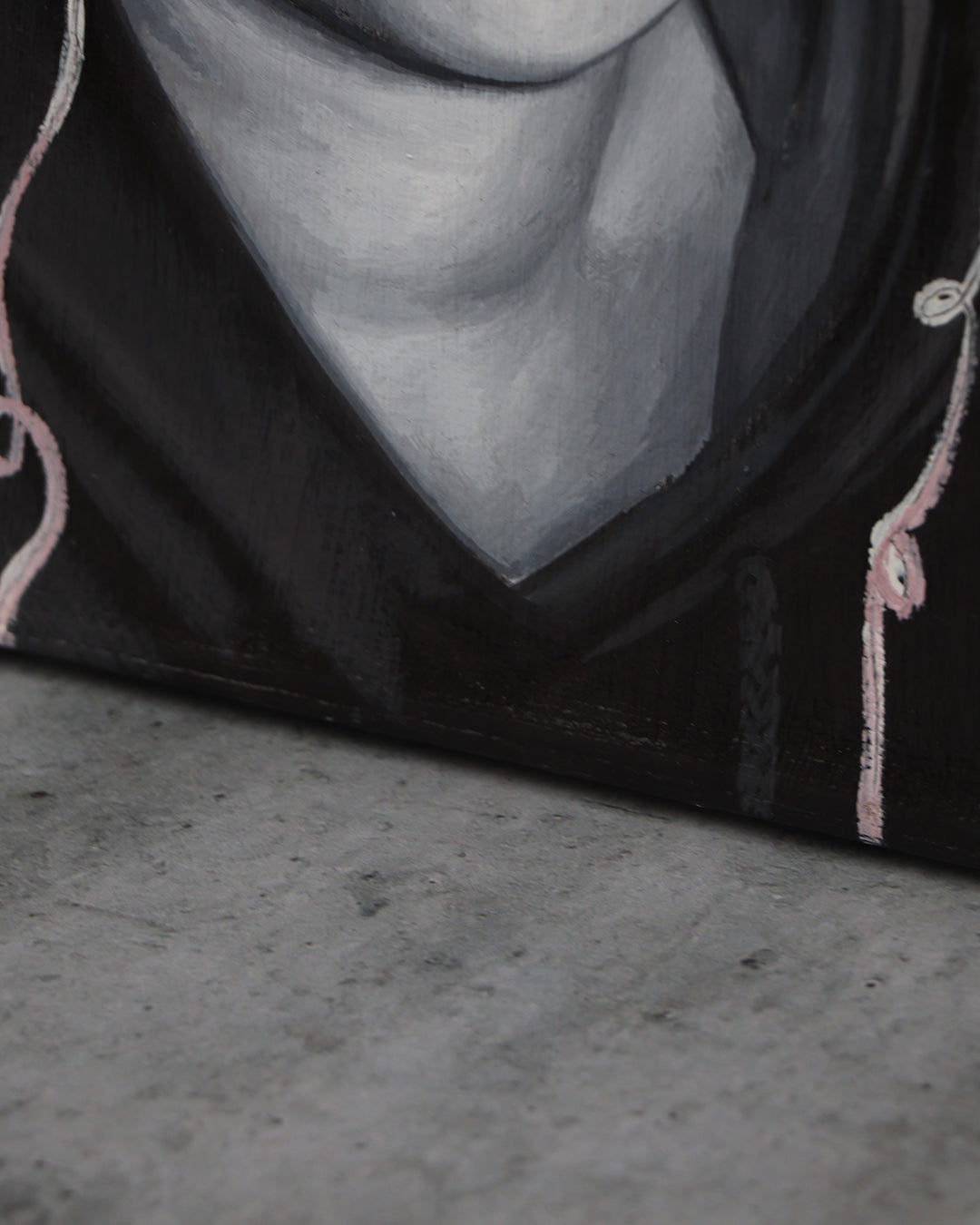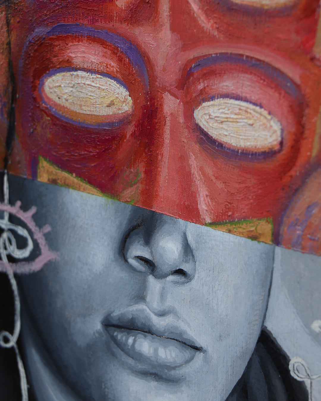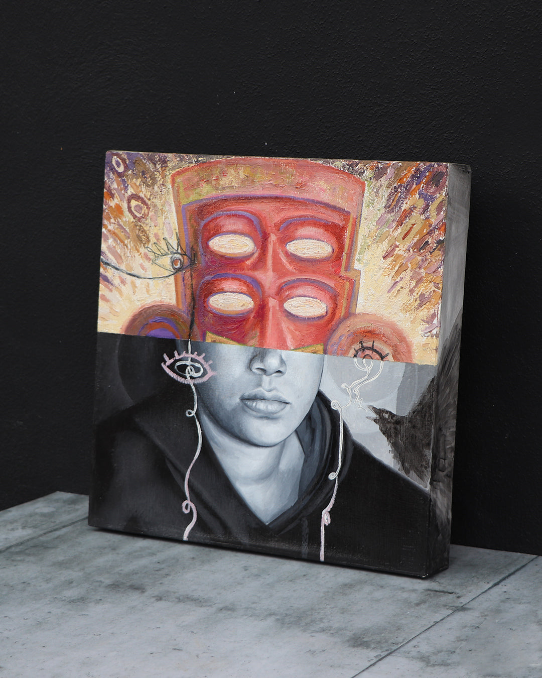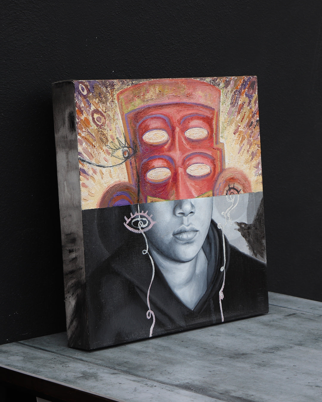 Una obra que fusiona el simbolismo ancestral con la introspección contemporánea. La parte superior, llena de color y energía, representa un rostro ceremonial de múltiples ojos, evocando sabiduría y visión interior. En contraste, la mitad inferior muestra un retrato realista en blanco y negro, donde la expresión serena sugiere contemplación y duda. Entre ambas mitades, líneas sutiles y ojos flotantes conectan los mundos de lo espiritual y lo humano, revelando el conflicto interno de la indecisión.