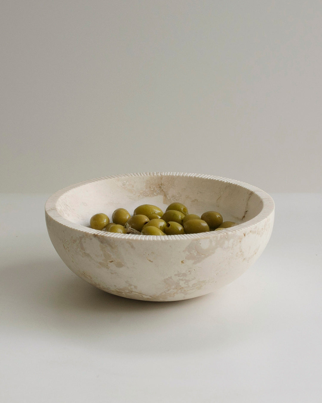 Pieza elaborada en piedra crema maya, tallada de manera totalmente artesanal por artesanos yucatecos. Su forma retoma la sencillez y funcionalidad de los objetos cotidianos, mientras que el borde estriado introduce un detalle sutil que evoca los acabados y texturas de las construcciones tradicionales de palo y huano que aún recorren las calles de Yucatán.