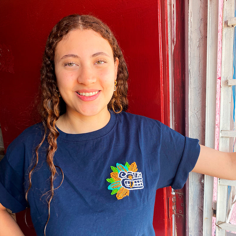 · Con Quetzalcóatl bordado a mano con chaquira en pecho izquierdo, utilizando colores dorado, azul aqua y verde, hilo mouliné blanco 100% algodón y chaquiras en color dorado (9cmx9cm)