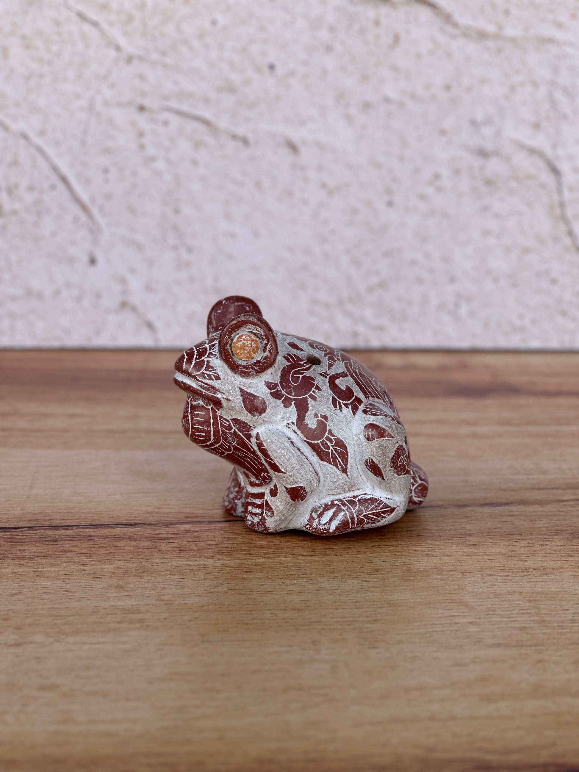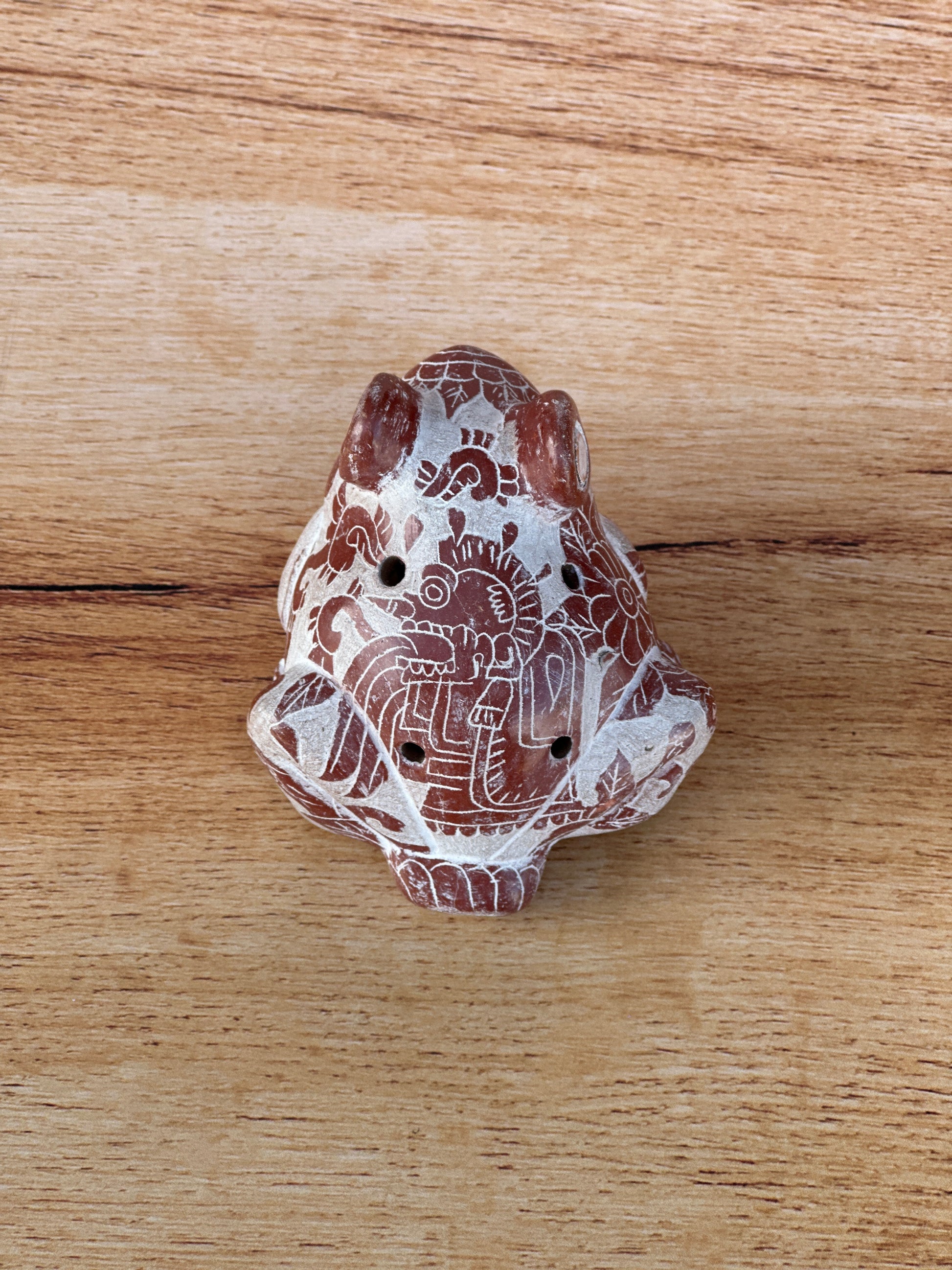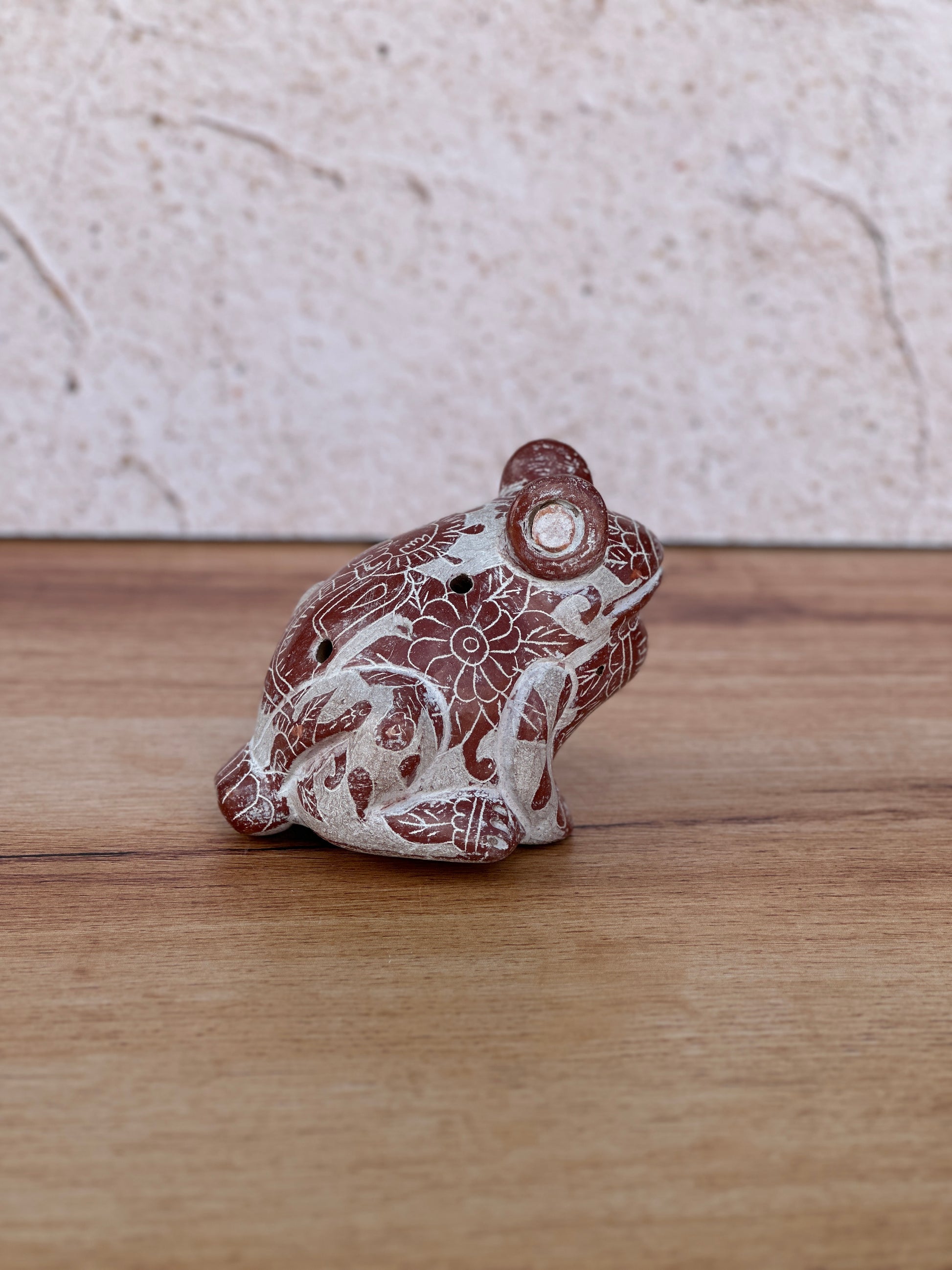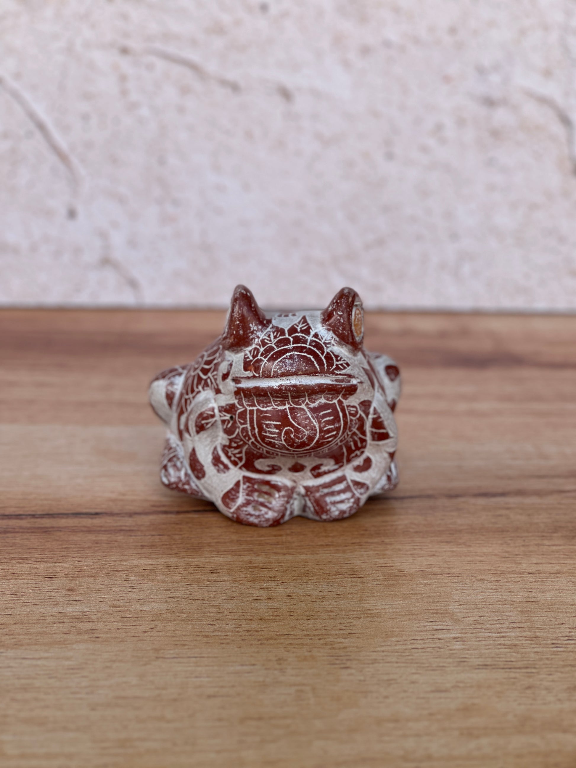 rana de barro cocido con grabado hecho a mano de la deidad mexica mictlantecuhtli