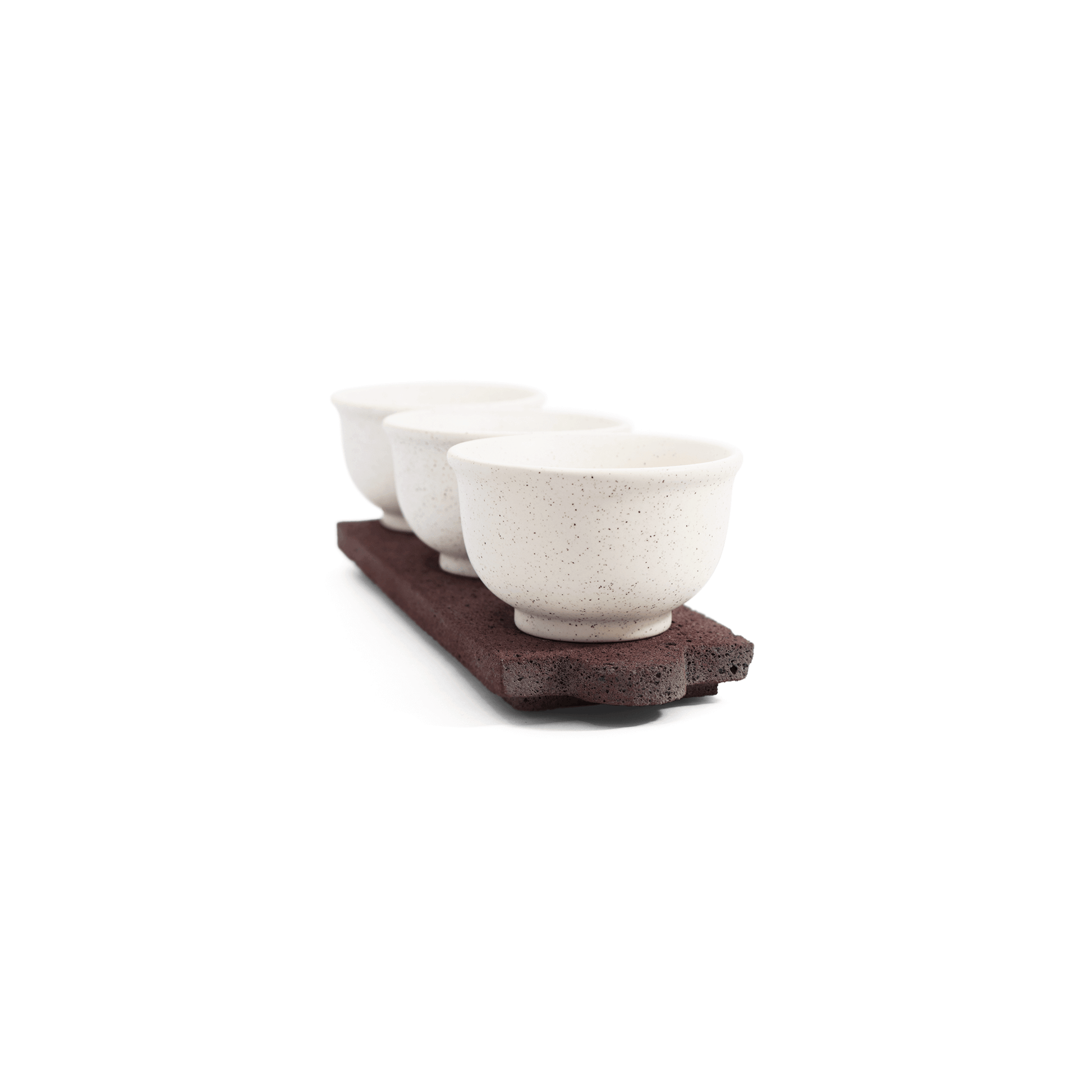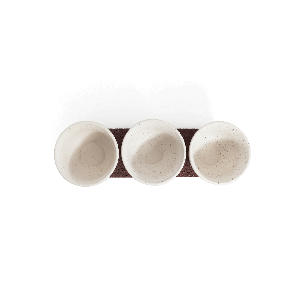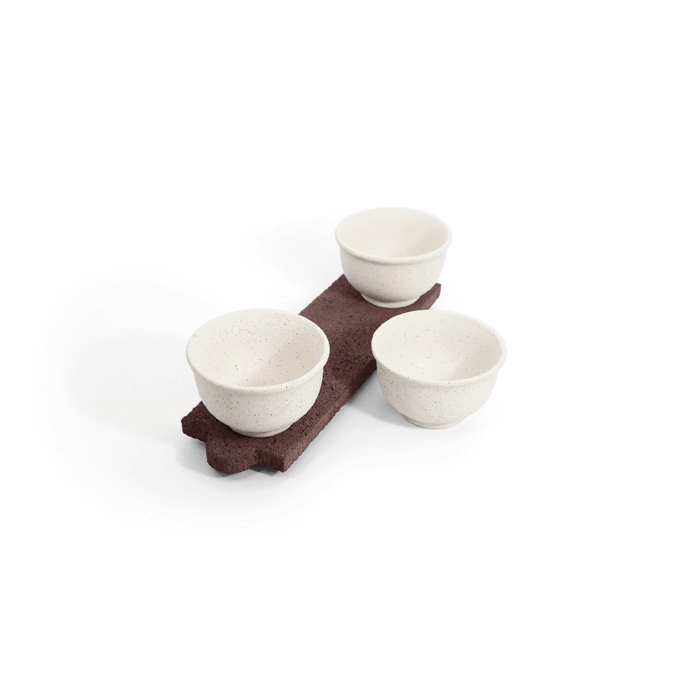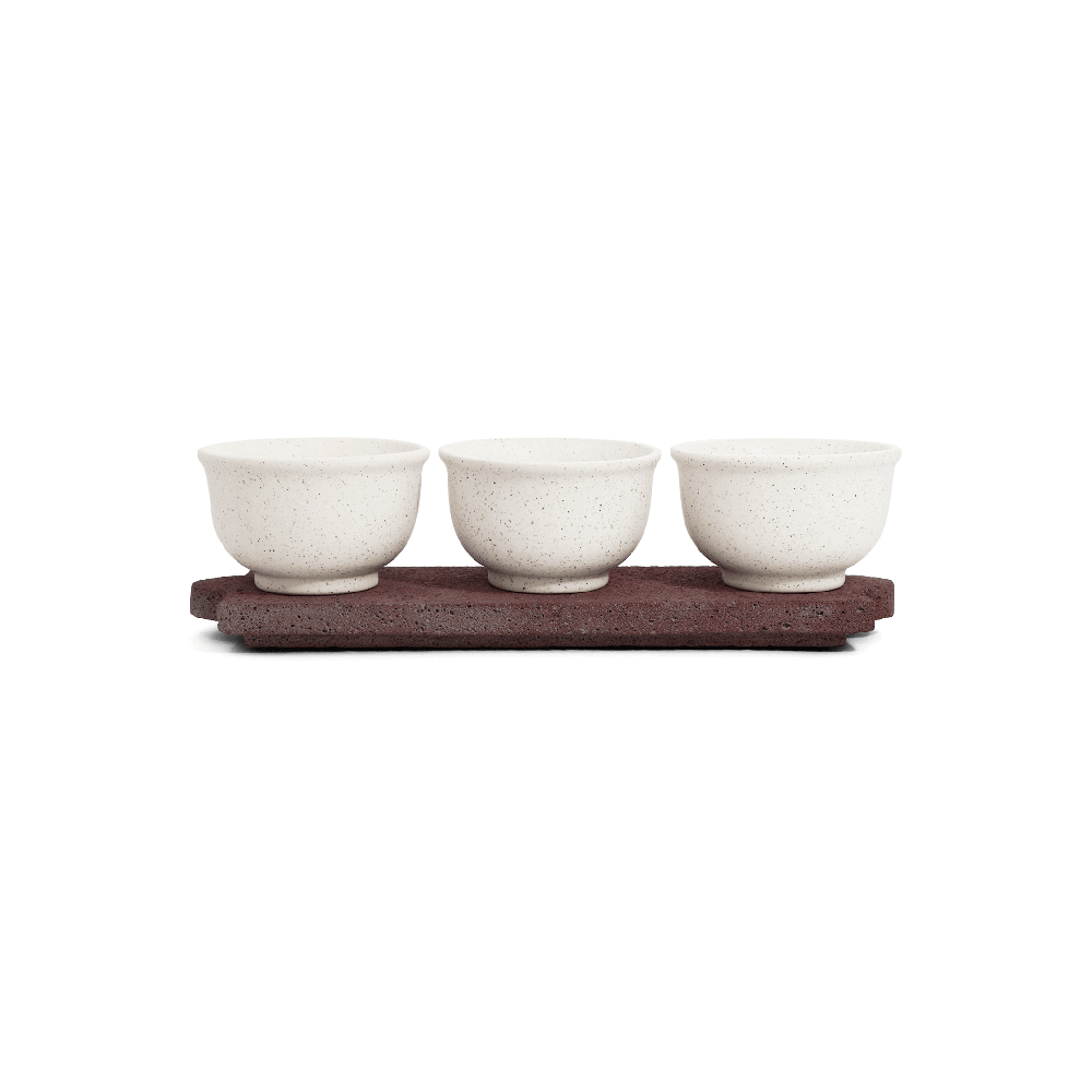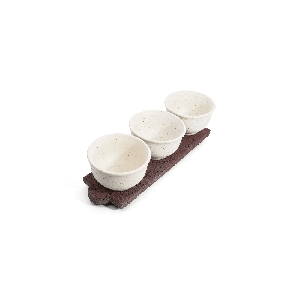 ·Juego de 3 salseras de cerámica con base de tezontle rojo.