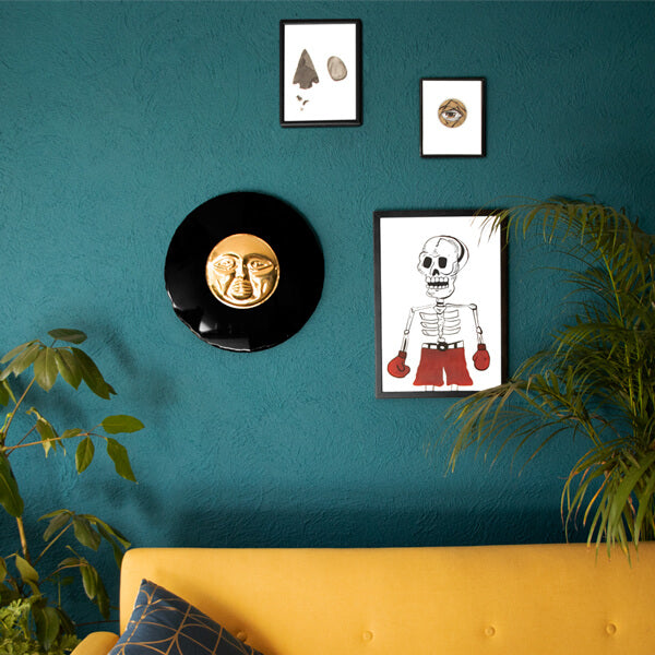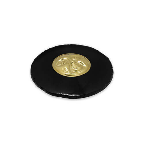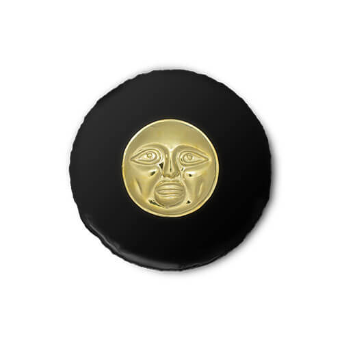 Espejo de obsidiana negra de 45cm de diámetro x 12mm de espesor. Circunferencia acabado lascado y una cara pulido espejo. Pieza de latón hecha a mano de 20cm de diámetro Incluye herraje para colgar.