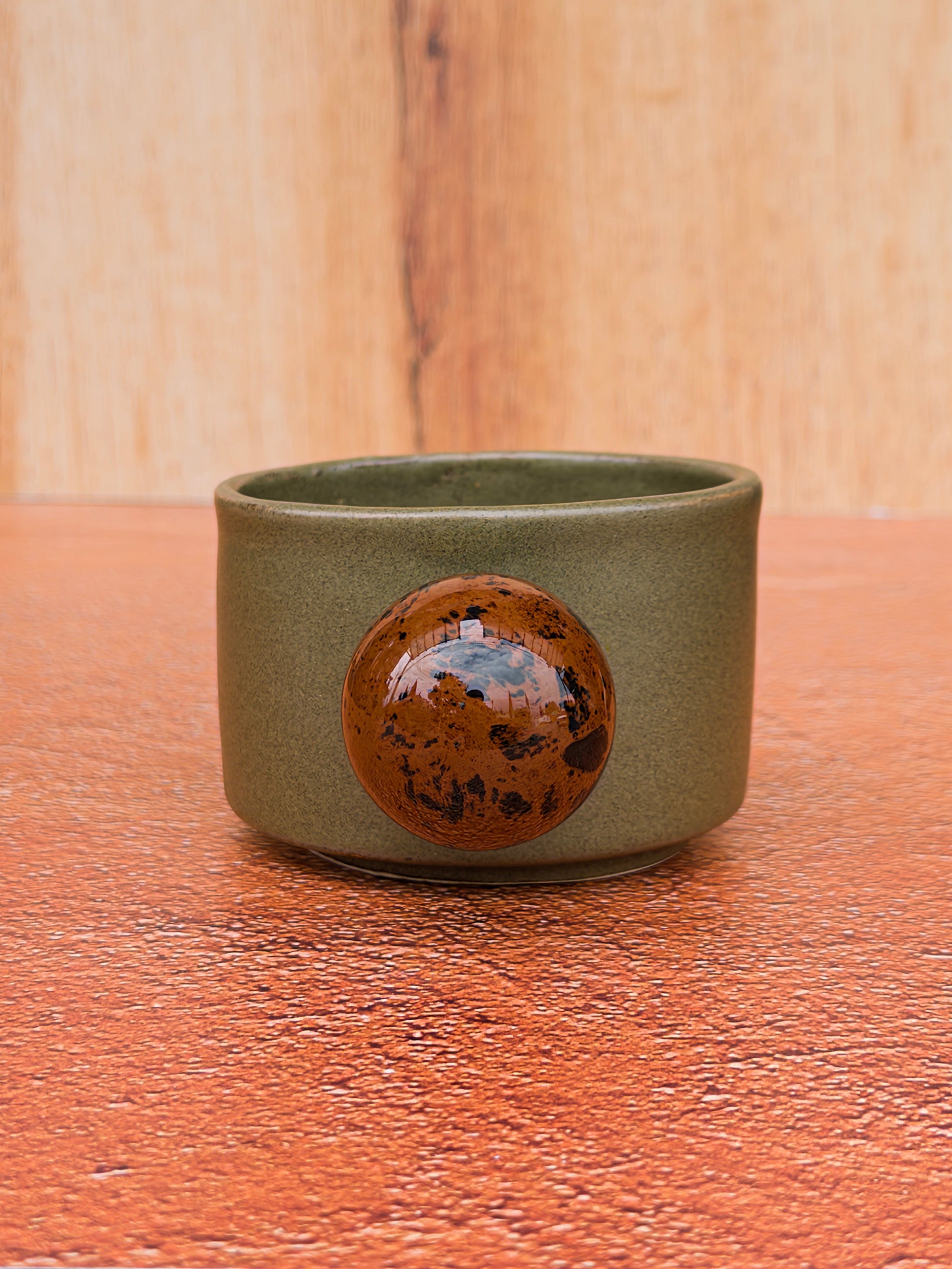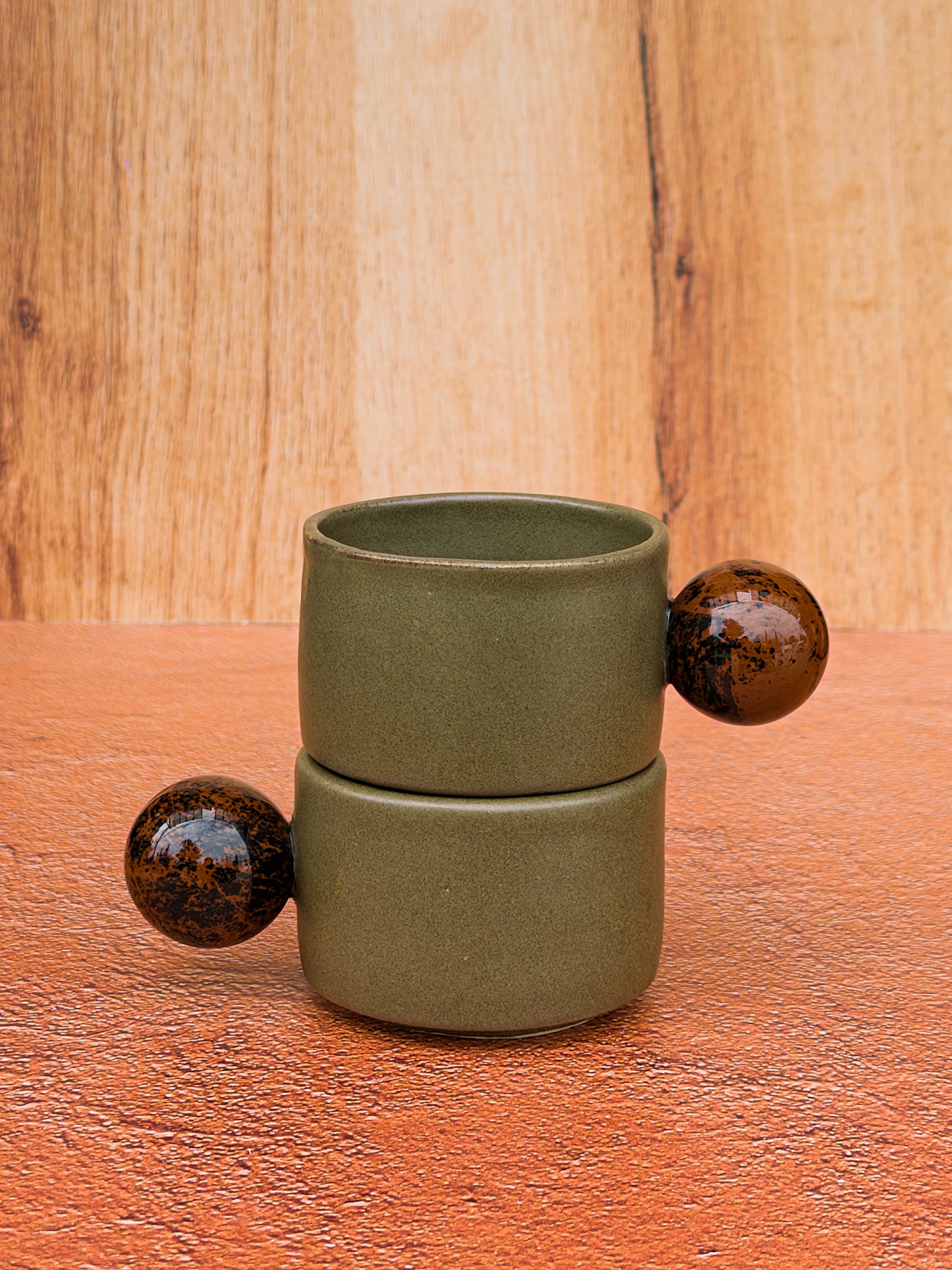 Set de dos tazas de cerámica verde olivo con esfera de obsidiana café. Piezas hechas a mano en torno, esmalte de óxidos naturales, 100% libres de plomo, seguras para consumo de bebidas frías y calientes.