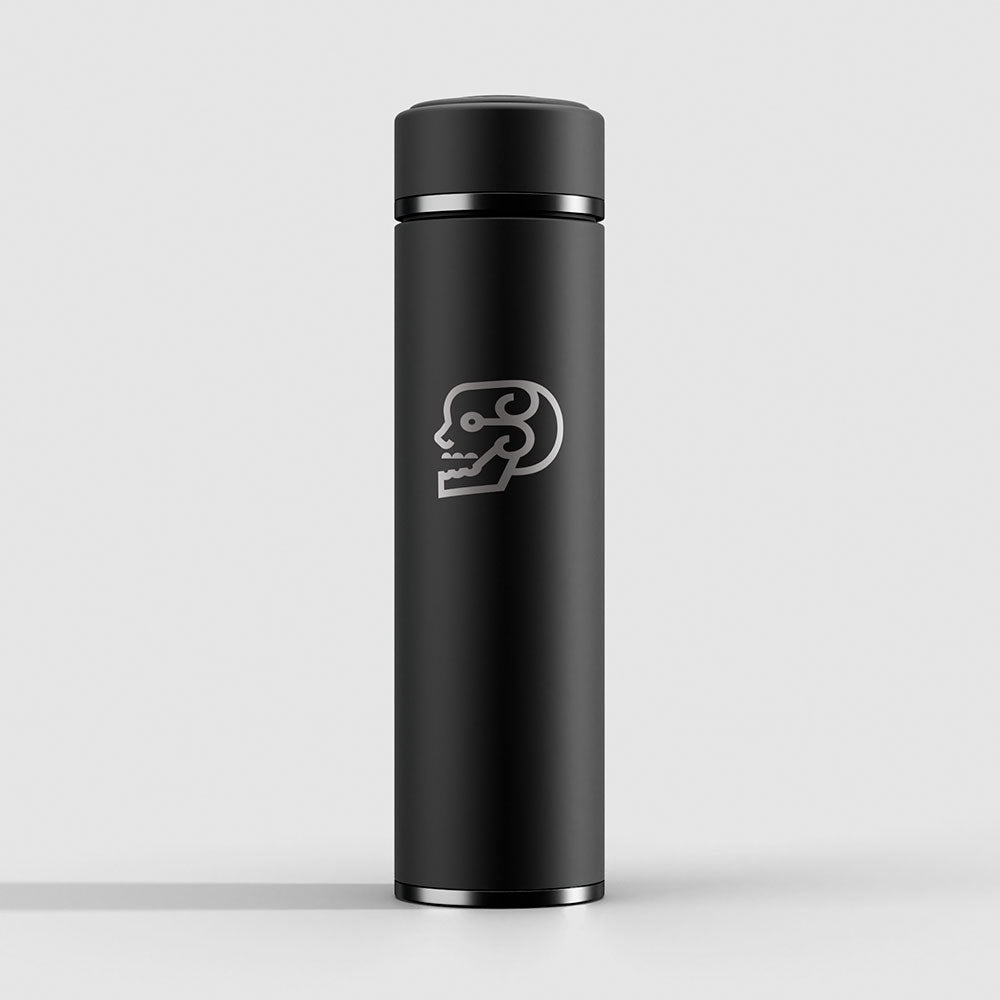 Termo de acero inoxidable, color negro con grabado cráneo.