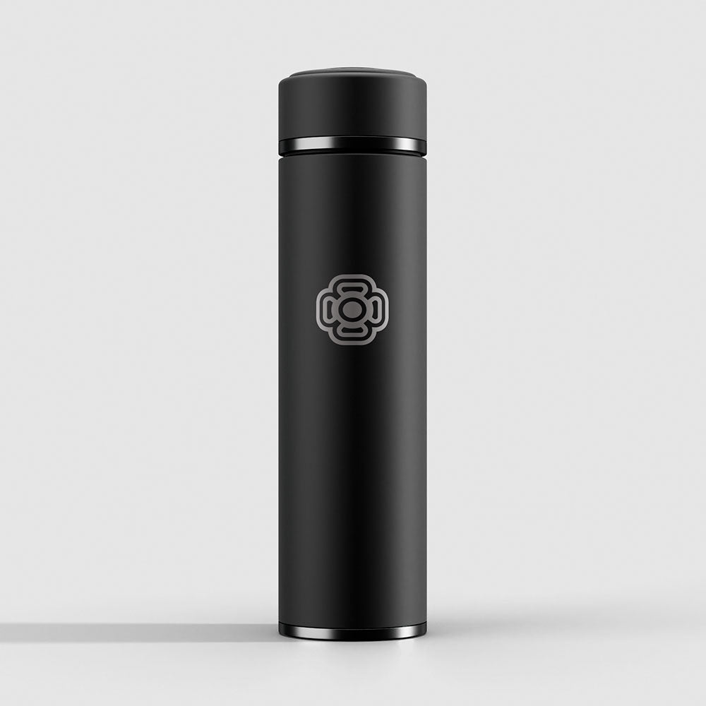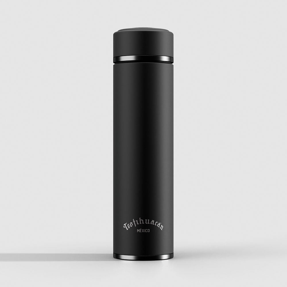 Termo de acero inoxidable, color negro con grabado flor teotihuacana.