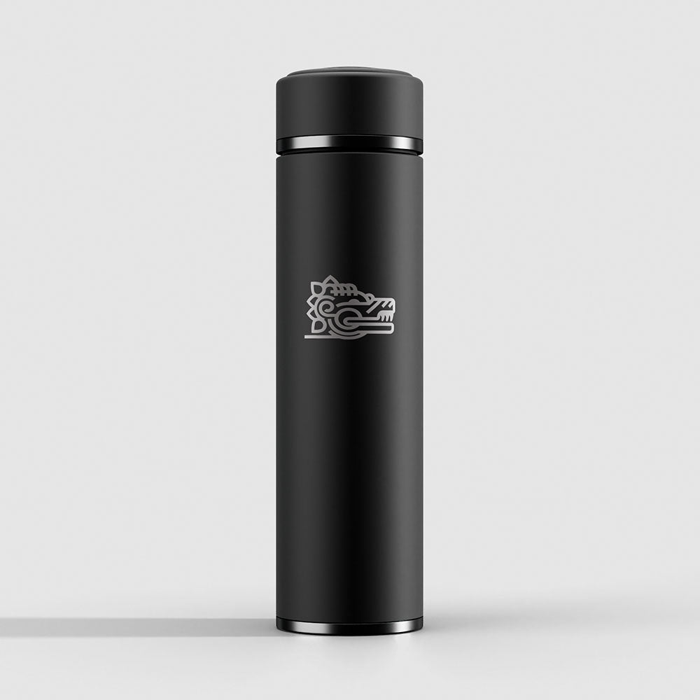 Termo de acero inoxidable, color negro con grabado Quetzalcóatl.