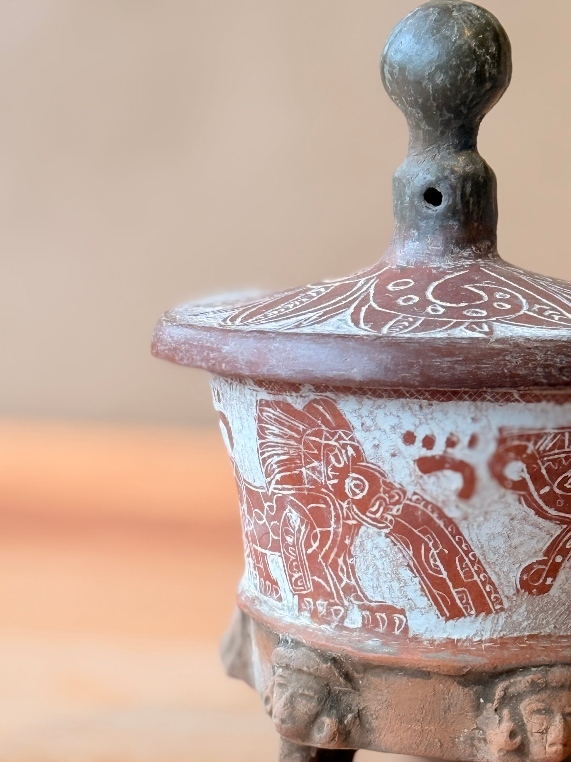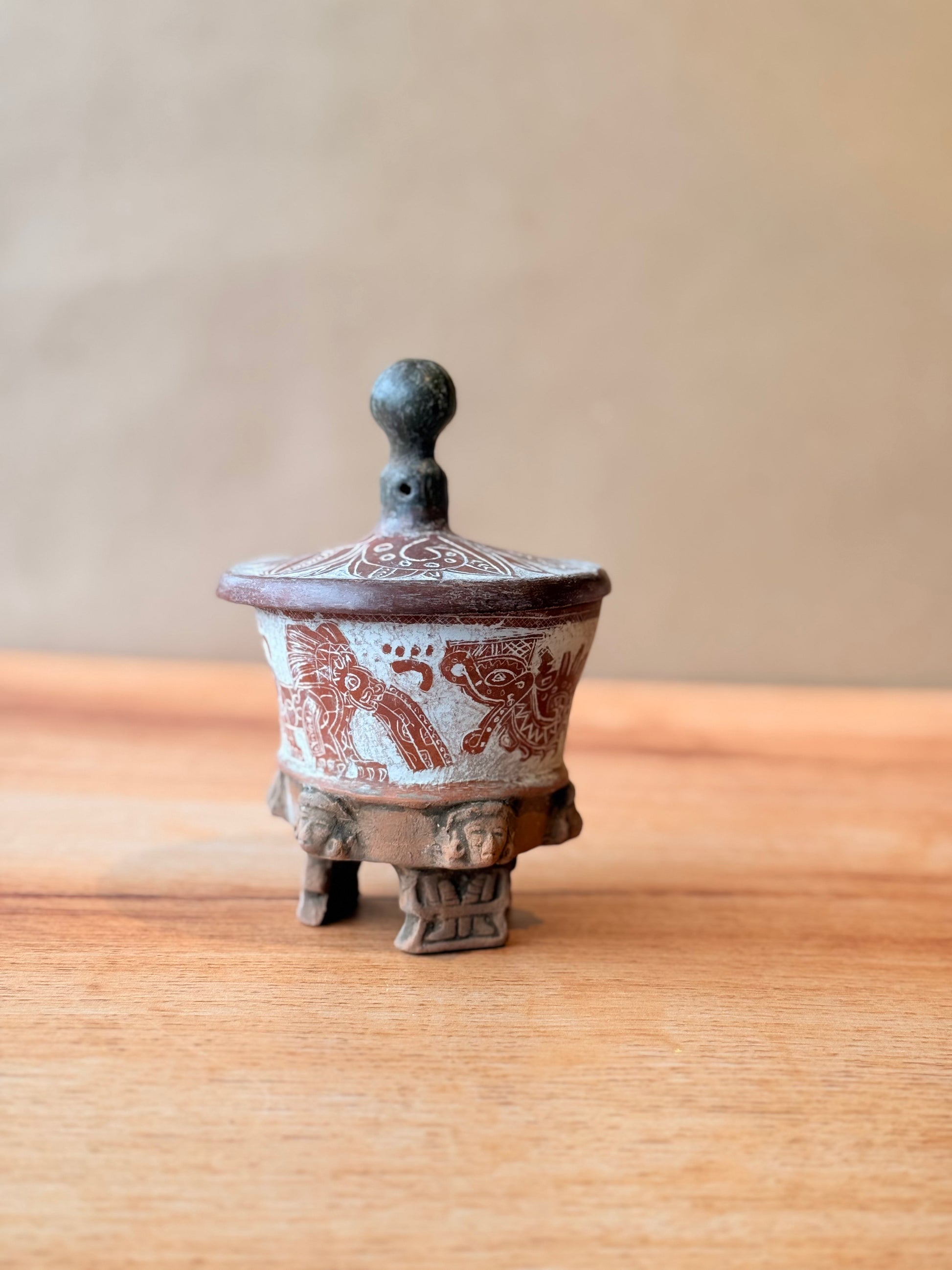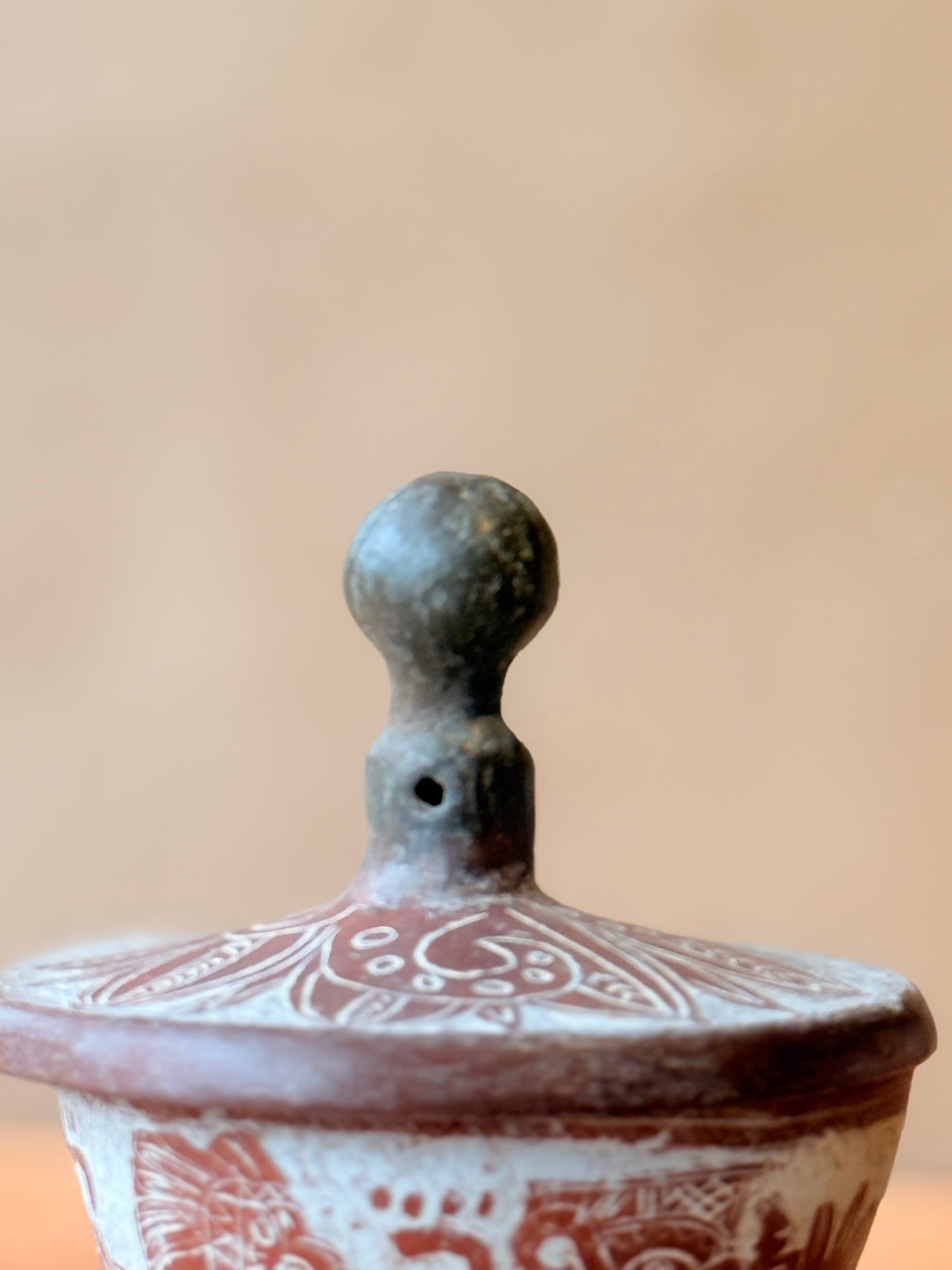 Vasija chica grabada trípode con tapa quetzalcoatl