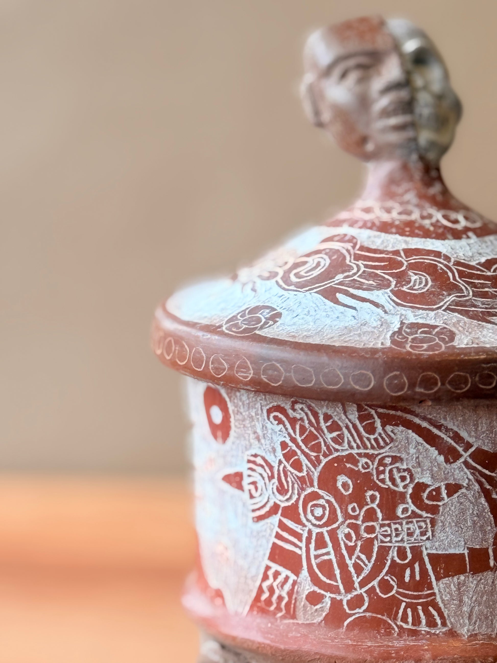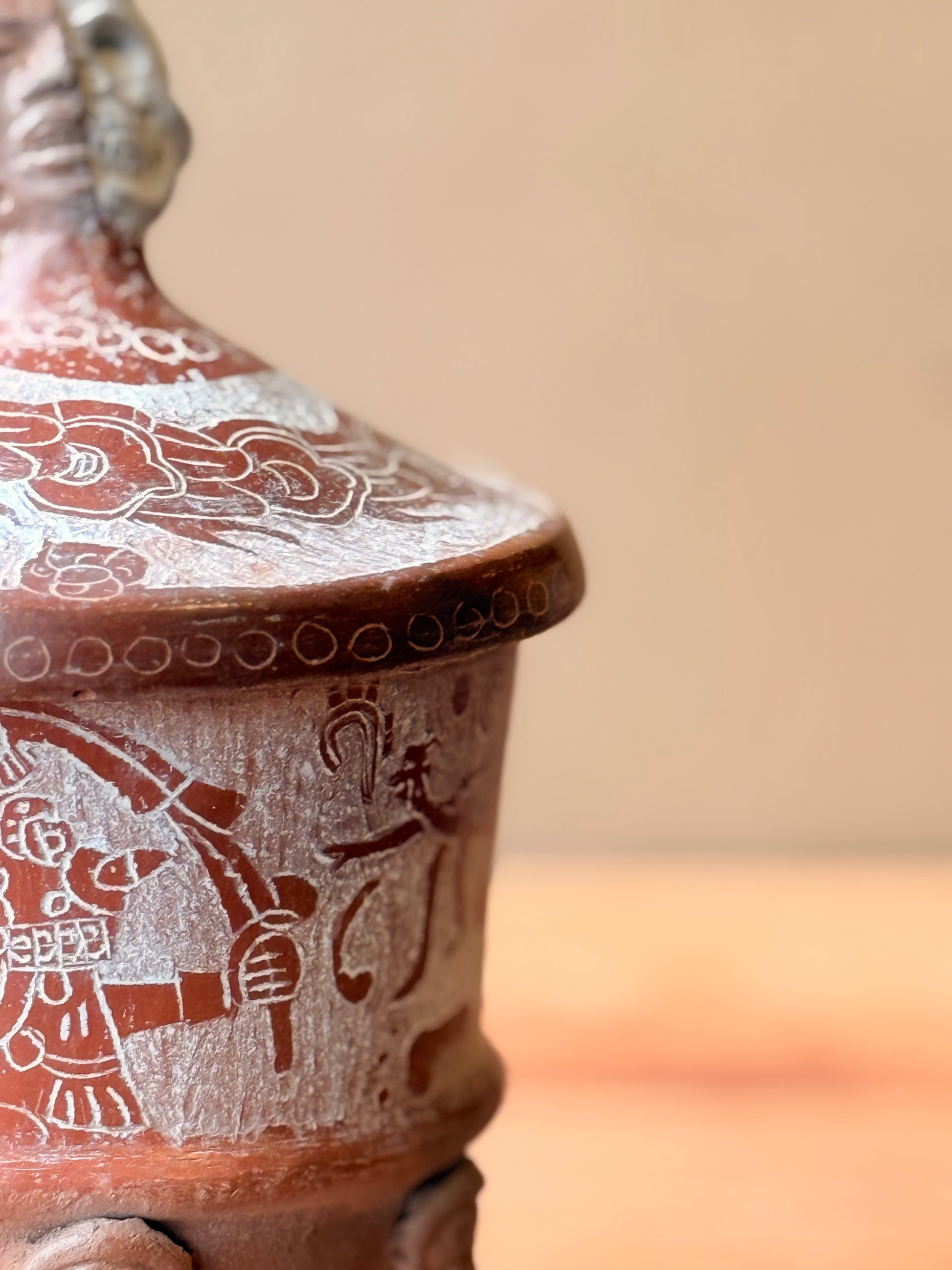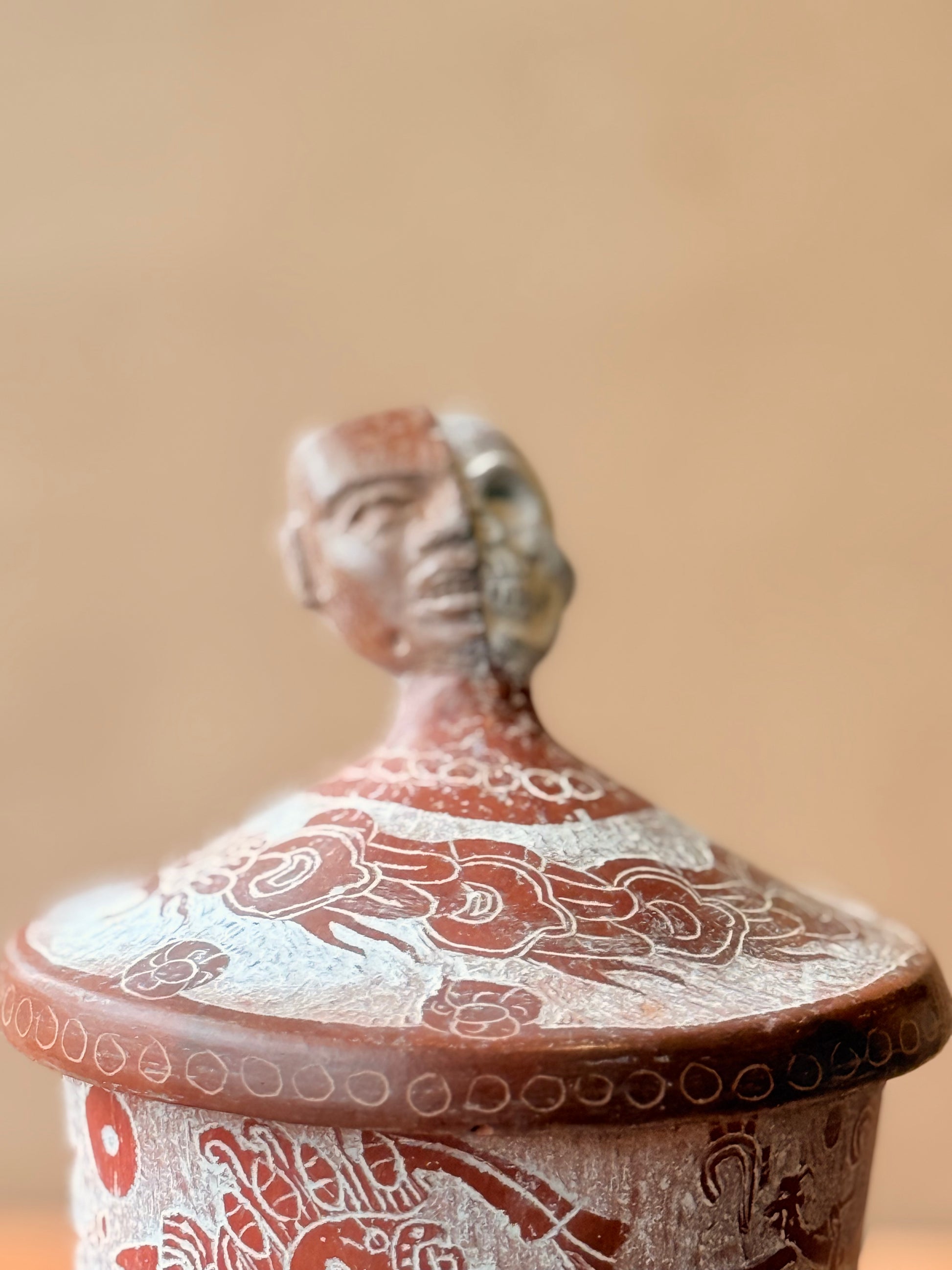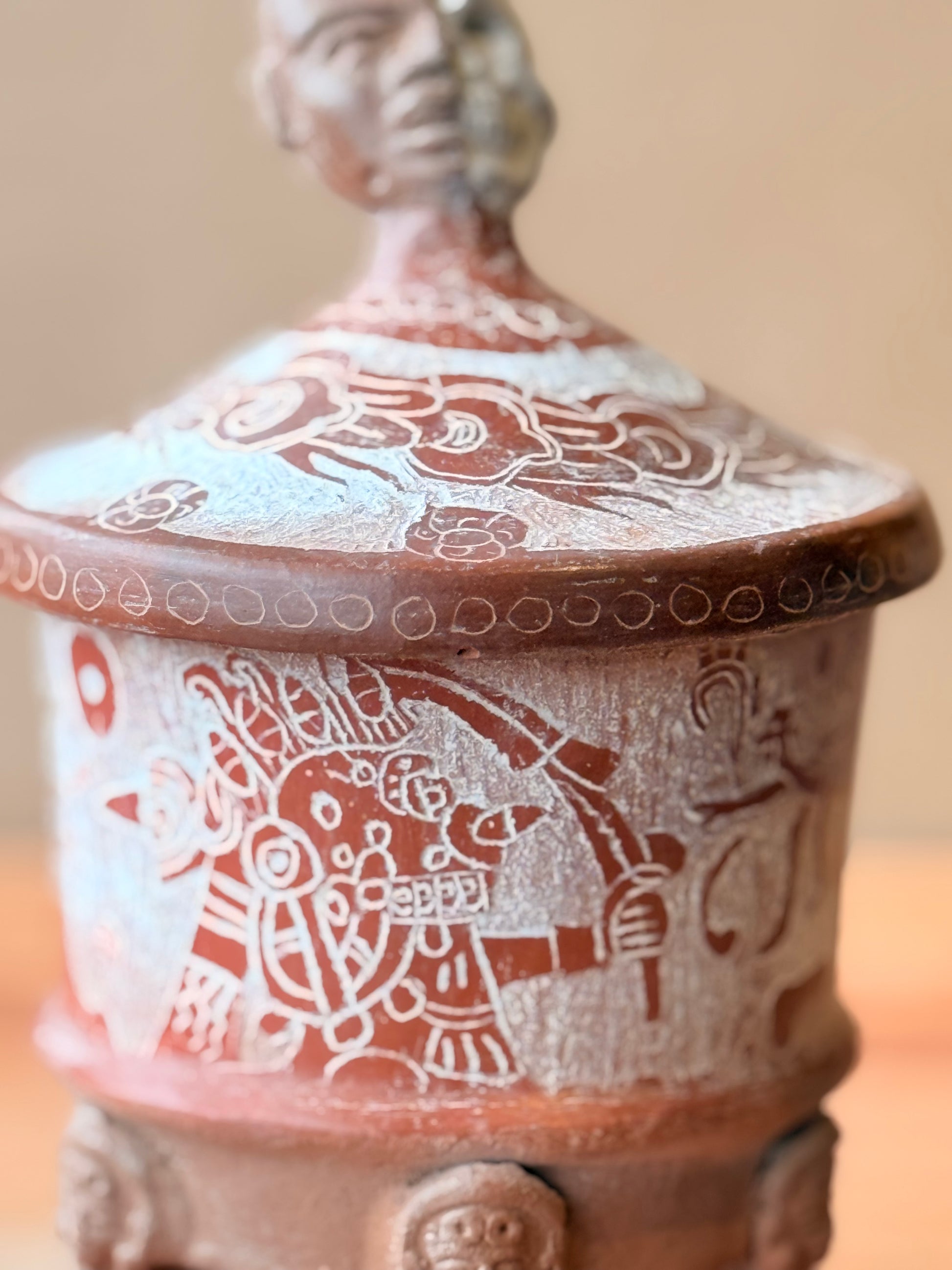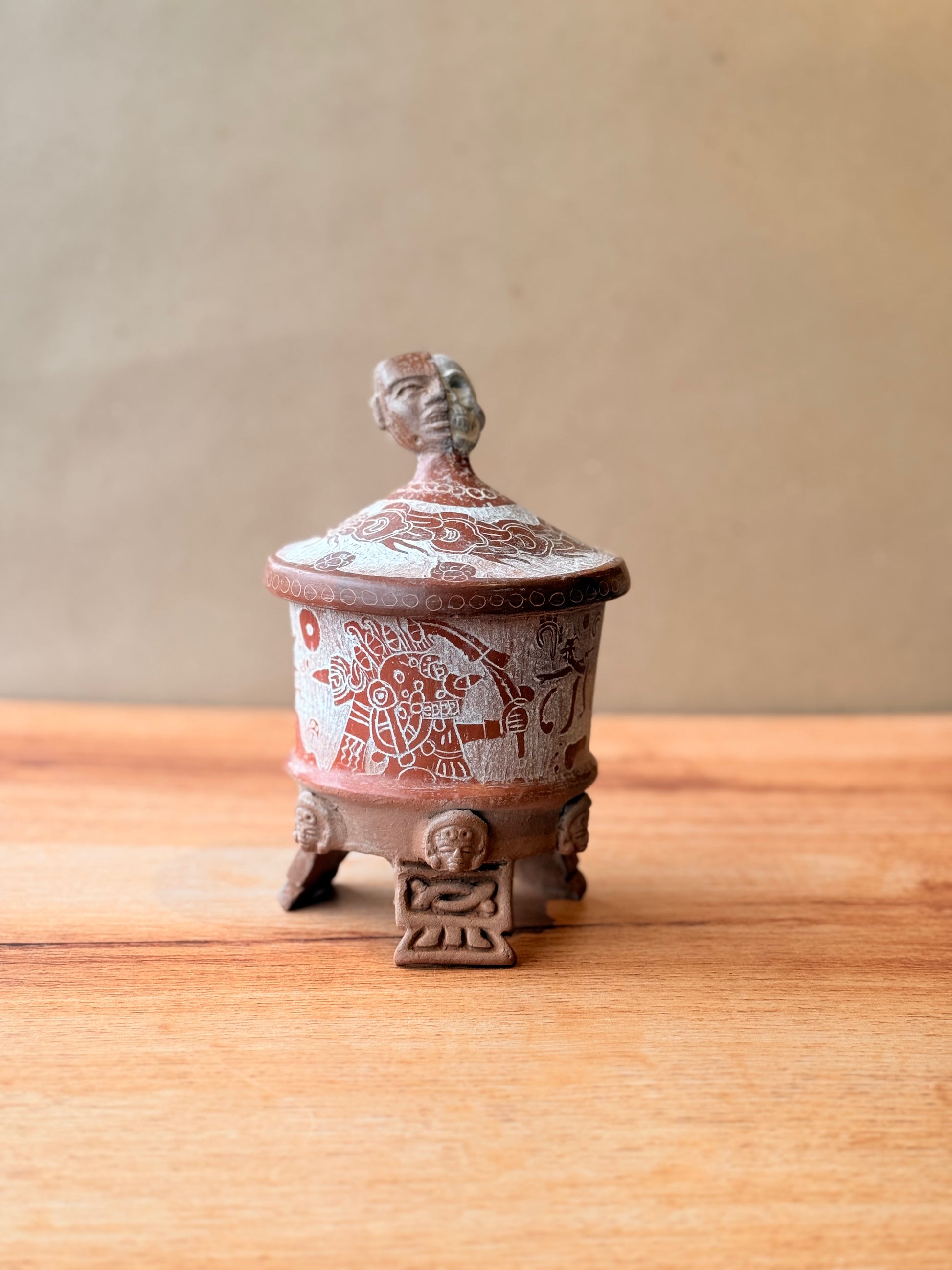 Vasija grabada trípode con tapa y mascara teotihuacana