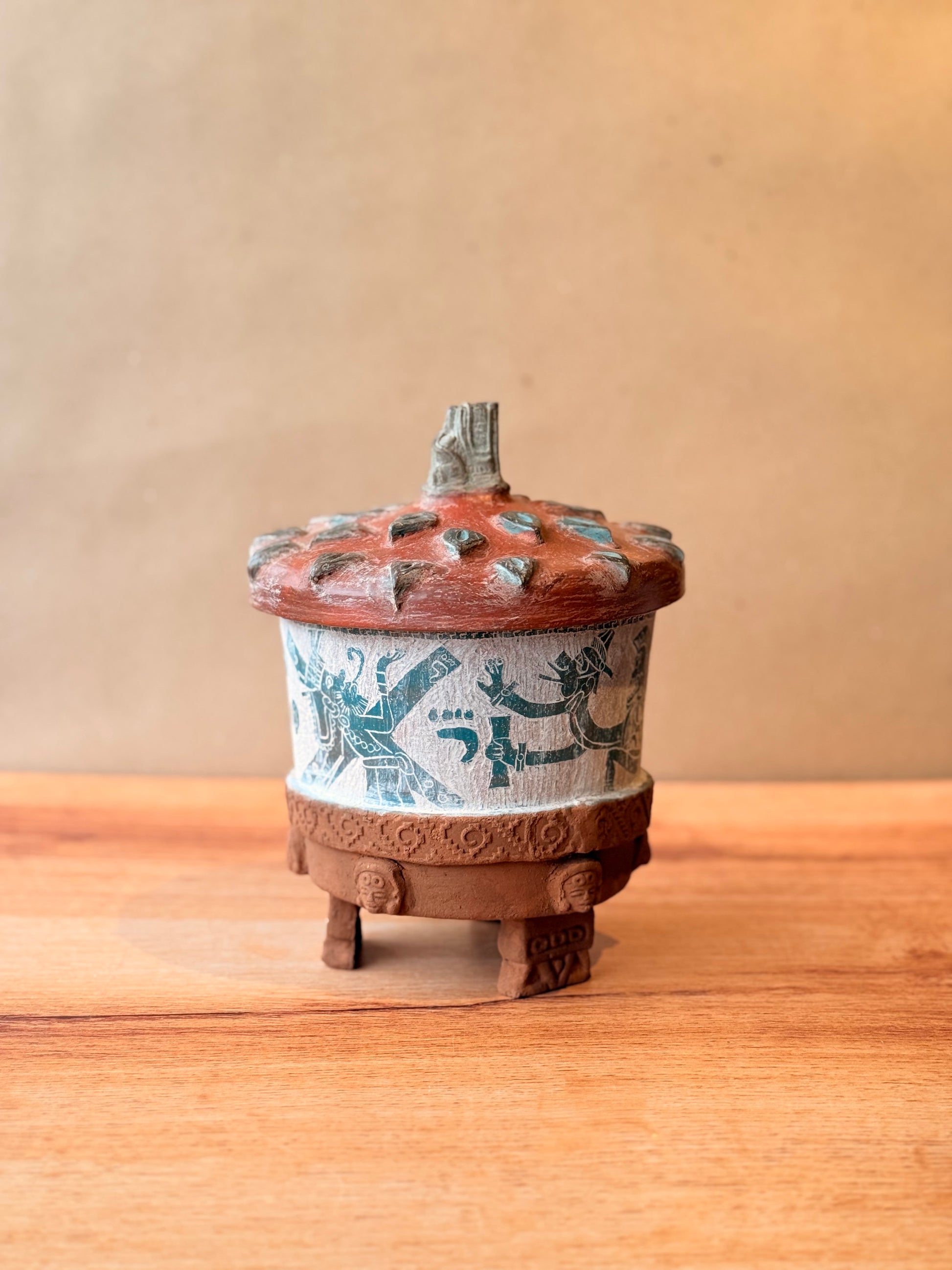 Vasija grande grabada trípode con tapa quetzalcoatl