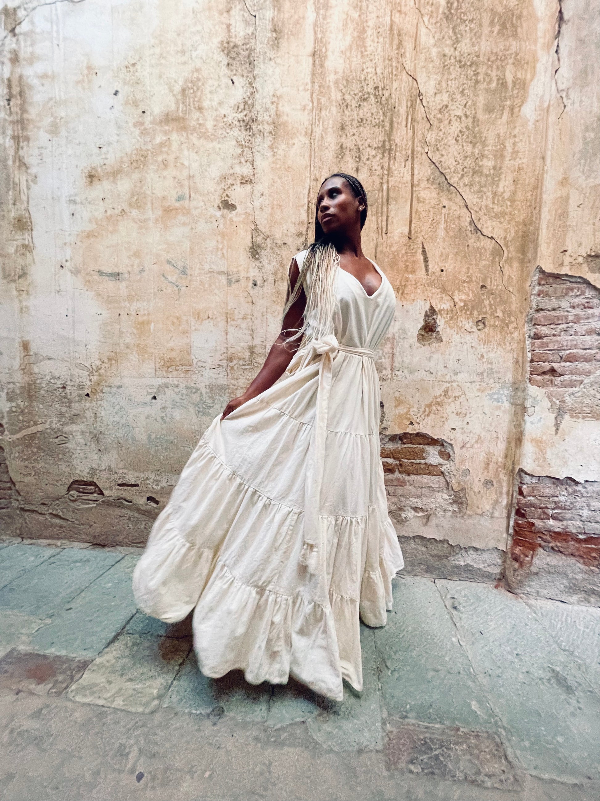Corte imperio escote moderno y falda larga con vuelo acompañada por cinto con flecos de algodón.